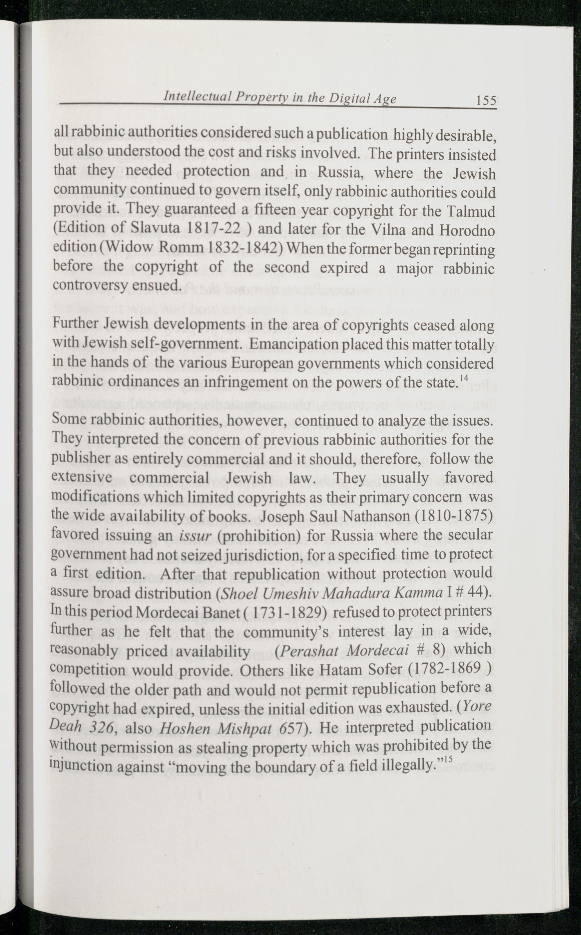 extensive commercial Jewish law. They usually favored modifications which limited copyrights as their primary concern was the wide availability of books. Joseph Saul Nathanson (1810-1875) favored issuing an issur(prohibition) for Russia where the secular government had not seized jurisdiction, for a specified time to protect a first edition. After that republication without protection would assure broad distribution(Shoel Umeshiv Mahadura Kamma 1# 44). In this period Mordecai Banet( 1731-1829) refused to protect printers further as he felt that the community's interest lay in a wide, reasonably priced availability(Perashat Mordecai# 8) which competition would provide. Others like Hatam Sofer (1782-1869) followed the older path and would not permit republication before a copyright had expired, unless the initial edition was exhausted.(Yore Deah 326, also Hoshen Mishpat 657). He interpreted publication Without permission as stealing property which was prohibited by the injunction against“moving the boundary of a field illegally.”