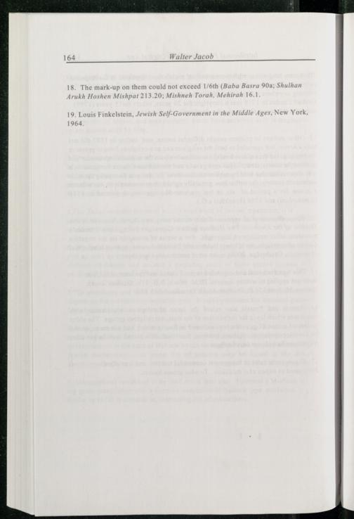 Walter Jacob 18. The mark-up on them could not exceed 1/6th(Baba Basra 90a; Shulhan {rukh Hoshen Mishpat 213.20; Mishneh Torah, Mehirah 16.1 19. Louis Finkelstein , Jewish Self-Government in the Middle Aces, New York , 1964