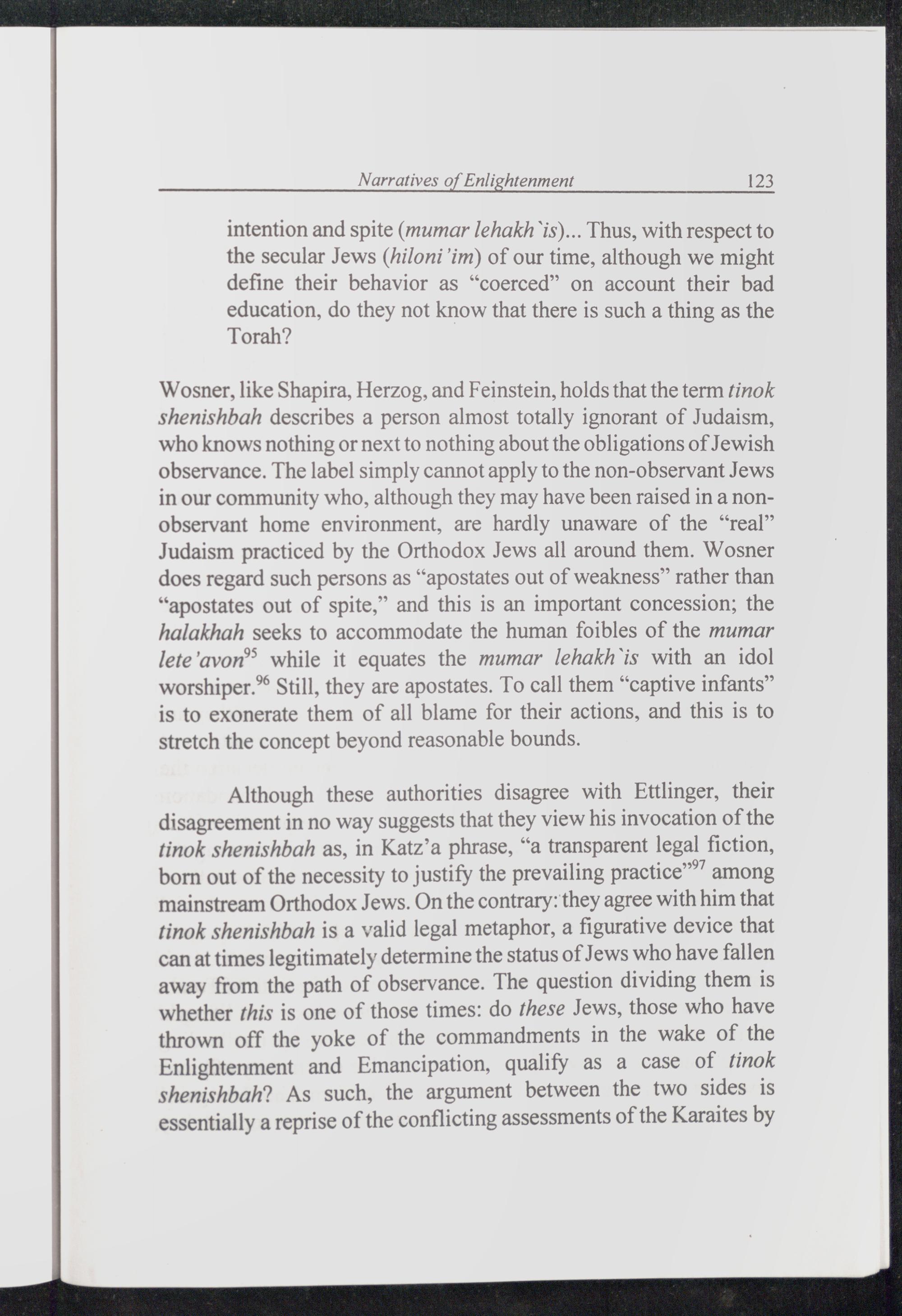 Although these authorities disagree with Ettlinger, their disagreement in no way suggests that they view his invocation of the tinok shenishbah as, in Katz’a phrase,“a transparent legal fiction, born out of the necessity to justify the prevailing practice™’ among mainstream Orthodox Jews . On the contrary: they agree with him that tinok shenishbah is a valid legal metaphor, a figurative device that can at times legitimately determine the status of Jews who have fallen away from the path of observance. The question dividing them is whether this is one of those times: do these Jews , those who have thrown off the yoke of the commandments in the wake of the Enlightenment and Emancipation, qualify as a case of tinok shenishbah? As such, the argument between the two sides is essentially a reprise of the conflicting assessments of the Karaites by