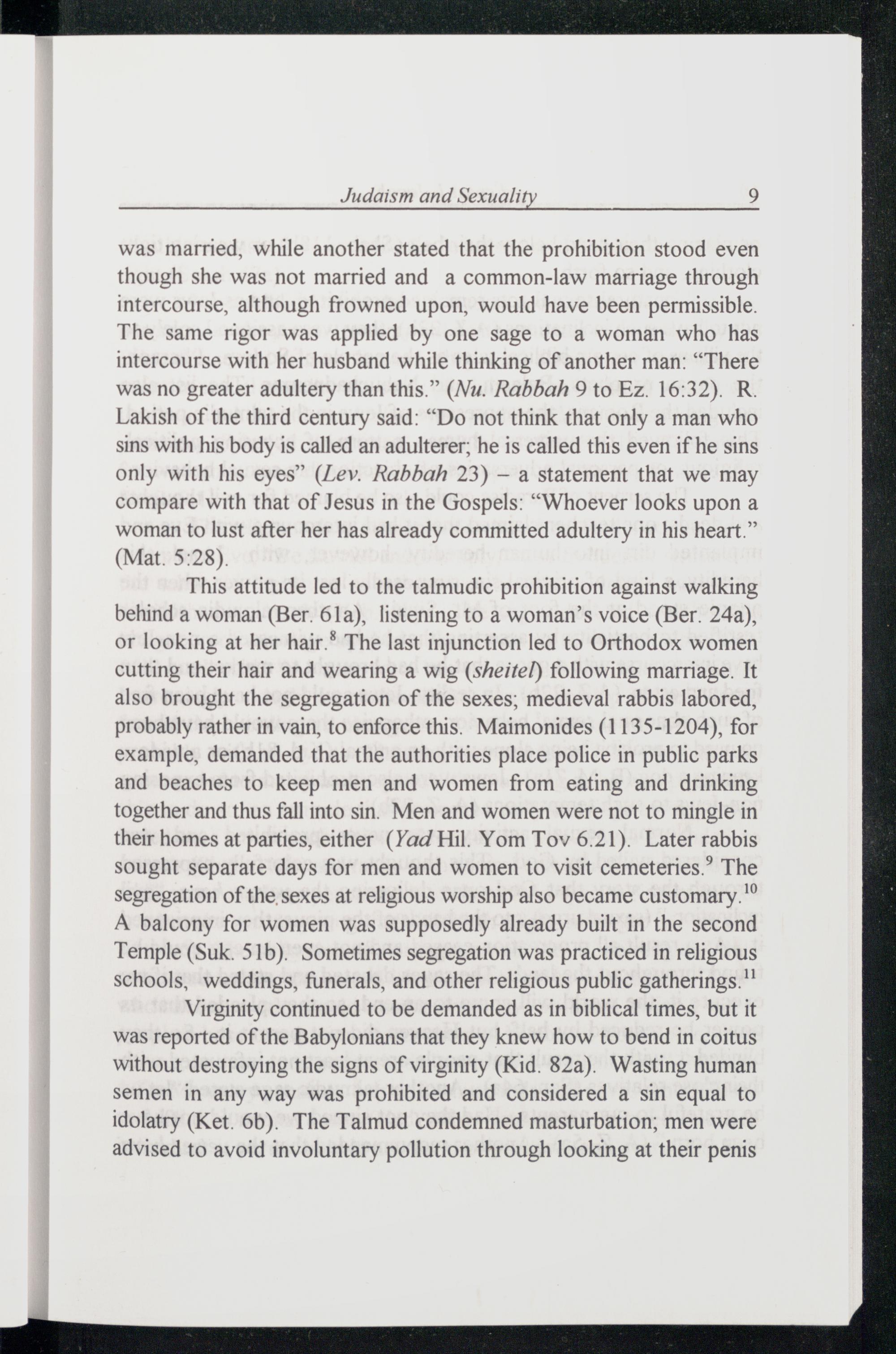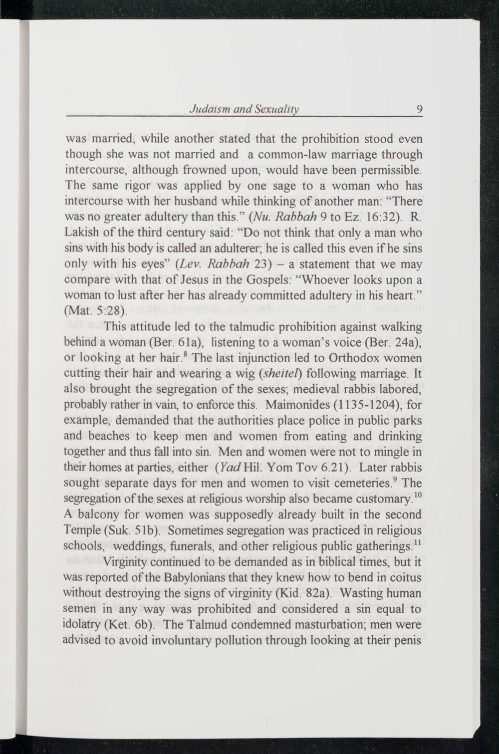 was married, while another stated that the prohibition stood even though she was not married and a common-law marriage through intercourse, although frowned upon, would have been permissible. The same rigor was applied by one sage to a woman who has intercourse with her husband while thinking of another man:“There was no greater adultery than this.”(Nu. Rabbah 9 to Ez. 16:32). R. Lakish of the third century said:“Do not think that only a man who sins with his body is called an adulterer; he is called this even if he sins only with his eyes”(Lev. Rabbah 23)— a statement that we may compare with that of Jesus in the Gospels:“Whoever looks upon a woman to lust after her has already committed adultery in his heart.” (Mat. 5:28).