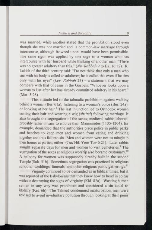 Virginity continued to be demanded as in biblical times, but it was reported of the Babylonians that they knew how to bend in coitus without destroying the signs of virginity(Kid. 82a). Wasting human semen in any way was prohibited and considered a sin equal to idolatry(Ket. 6b). The Talmud condemned masturbation; men were advised to avoid involuntary pollution through looking at their penis