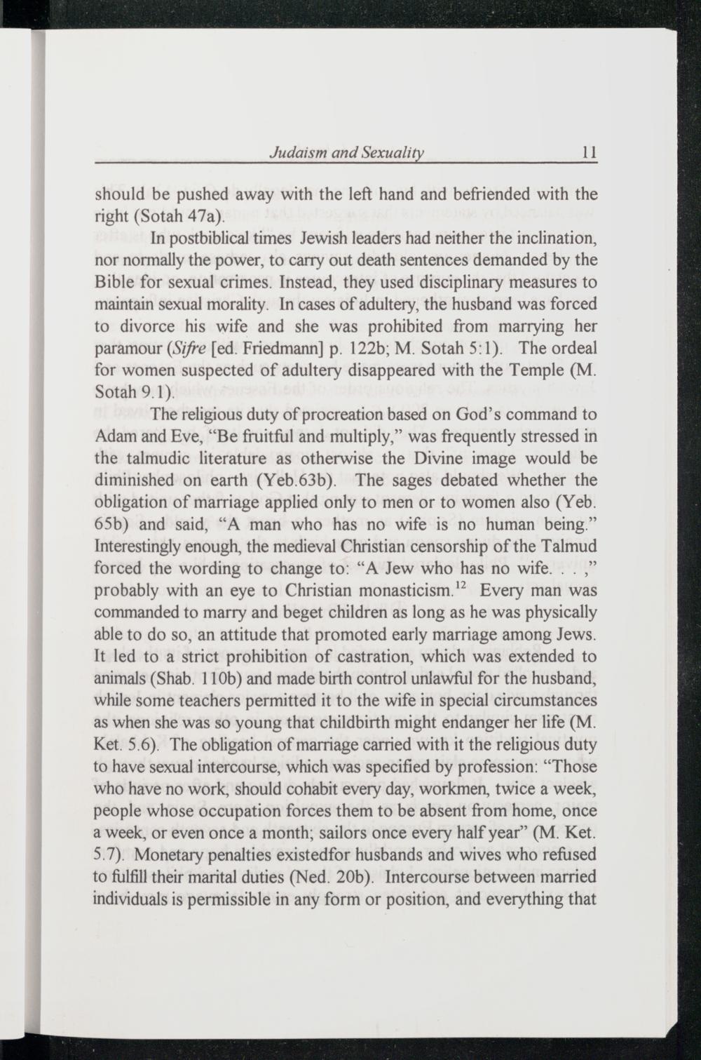 The religious duty of procreation based on God ’s command to Adam and Eve,“Be fruitful and multiply,” was frequently stressed in the talmudic literature as otherwise the Divine image would be diminished on earth(Yeb.63b). The sages debated whether the obligation of marriage applied only to men or to women also(Yeb. 65b) and said,“A man who has no wife is no human being.” Interestingly enough, the medieval Christian censorship of the Talmud forced the wording to change to:“A Jew who has no wife...)” probably with an eye to Christian monasticism.'> Every man was commanded to marry and beget children as long as he was physically able to do so, an attitude that promoted early marriage among Jews . It led to a strict prohibition of castration, which was extended to animals(Shab. 110b) and made birth control unlawful for the husband, while some teachers permitted it to the wife in special circumstances as when she was so young that childbirth might endanger her life(M. Ket. 5.6). The obligation of marriage carried with it the religious duty to have sexual intercourse, which was specified by profession:“Those who have no work, should cohabit every day, workmen, twice a week, people whose occupation forces them to be absent from home, once a week, or even once a month; sailors once every half year”(M. Ket. 5.7). Monetary penalties existedfor husbands and wives who refused to fulfill their marital duties(Ned. 20b). Intercourse between married individuals is permissible in any form or position, and everything that