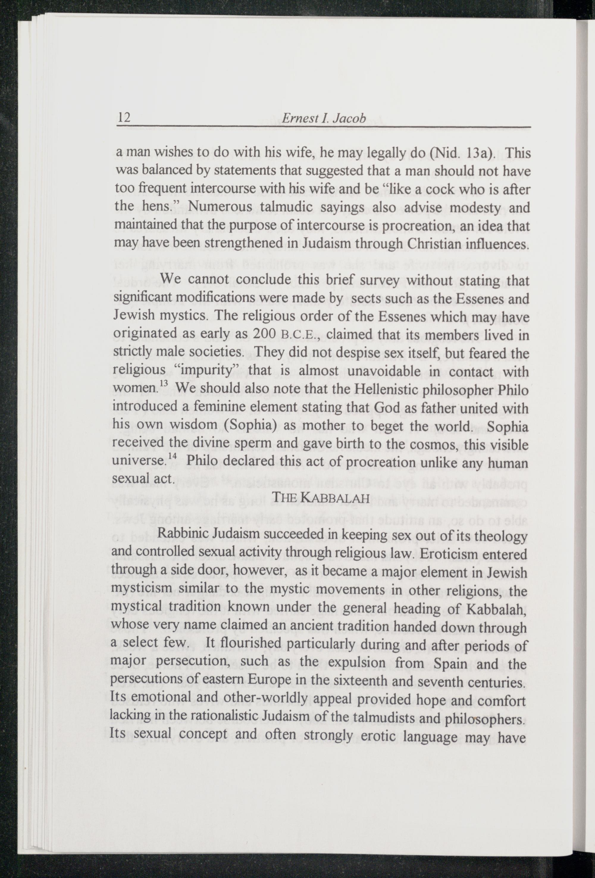 12 Ernest I. Jacob a man wishes to do with his wife, he may legally do(Nid. 13a). This was balanced by statements that suggested that a man should not have too frequent intercourse with his wife and be“like a cock who is after the hens.” Numerous talmudic sayings also advise modesty and maintained that the purpose of intercourse is procreation, an idea that may have been strengthened in Judaism through Christian influences.