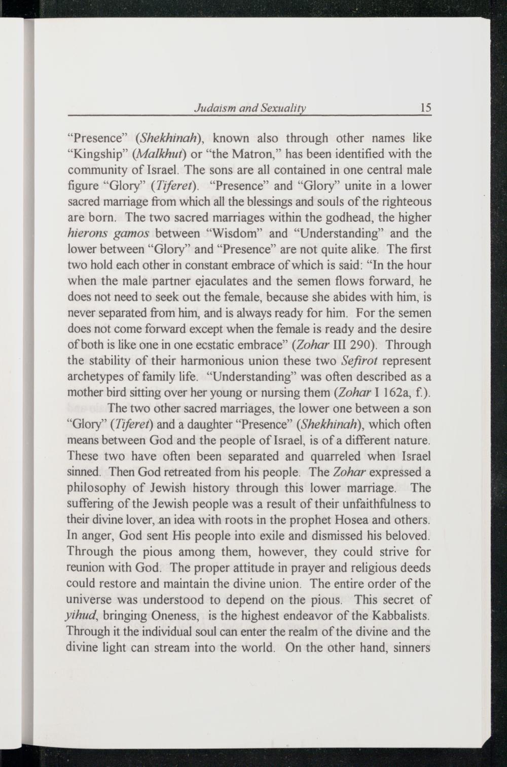 “Presence”(Shekhinah), known also through other names like “Kingship”(Malkhut) or“the Matron,” has been identified with the community of Israel . The sons are all contained in one central male figure“Glory”(7iferet).“Presence” and“Glory” unite in a lower sacred marriage from which all the blessings and souls of the righteous are born. The two sacred marriages within the godhead, the higher hierons gamos between“Wisdom ” and“Understanding” and the lower between“Glory” and“Presence” are not quite alike. The first two hold each other in constant embrace of which is said:“In the hour when the male partner ejaculates and the semen flows forward, he does not need to seek out the female, because she abides with him, is never separated from him, and is always ready for him. For the semen does not come forward except when the female is ready and the desire of both is like one in one ecstatic embrace”(Zohar 111 290). Through the stability of their harmonious union these two Sefirot represent archetypes of family life.“Understanding” was often described as a mother bird sitting over her young or nursing them(Zohar 1 162a, f.).