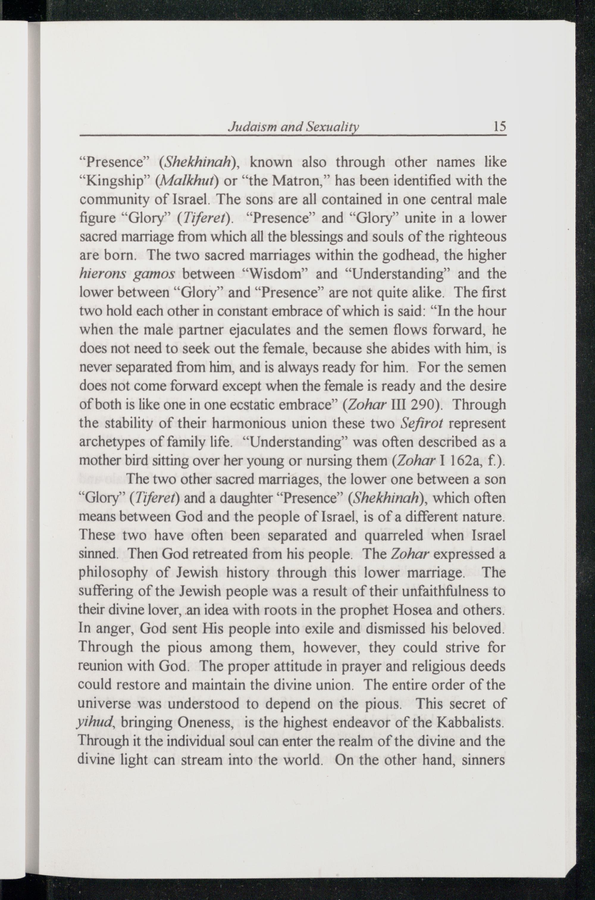 The two other sacred marriages, the lower one between a son “Glory”(Ziferef) and a daughter“Presence”(Shekhinah), which often means between God and the people of Israel , is of a different nature. These two have often been separated and quarreled when Israel sinned. Then God retreated from his people. The Zohar expressed a philosophy of Jewish history through this lower marriage. The suffering of the Jewish people was a result of their unfaithfulness to their divine lover, an idea with roots in the prophet Hosea and others. In anger, God sent His people into exile and dismissed his beloved. Through the pious among them, however, they could strive for reunion with God . The proper attitude in prayer and religious deeds could restore and maintain the divine union. The entire order of the universe was understood to depend on the pious. This secret of Yihud, bringing Oneness, is the highest endeavor of the Kabbalists . Through it the individual soul can enter the realm of the divine and the divine light can stream into the world. On the other hand, sinners