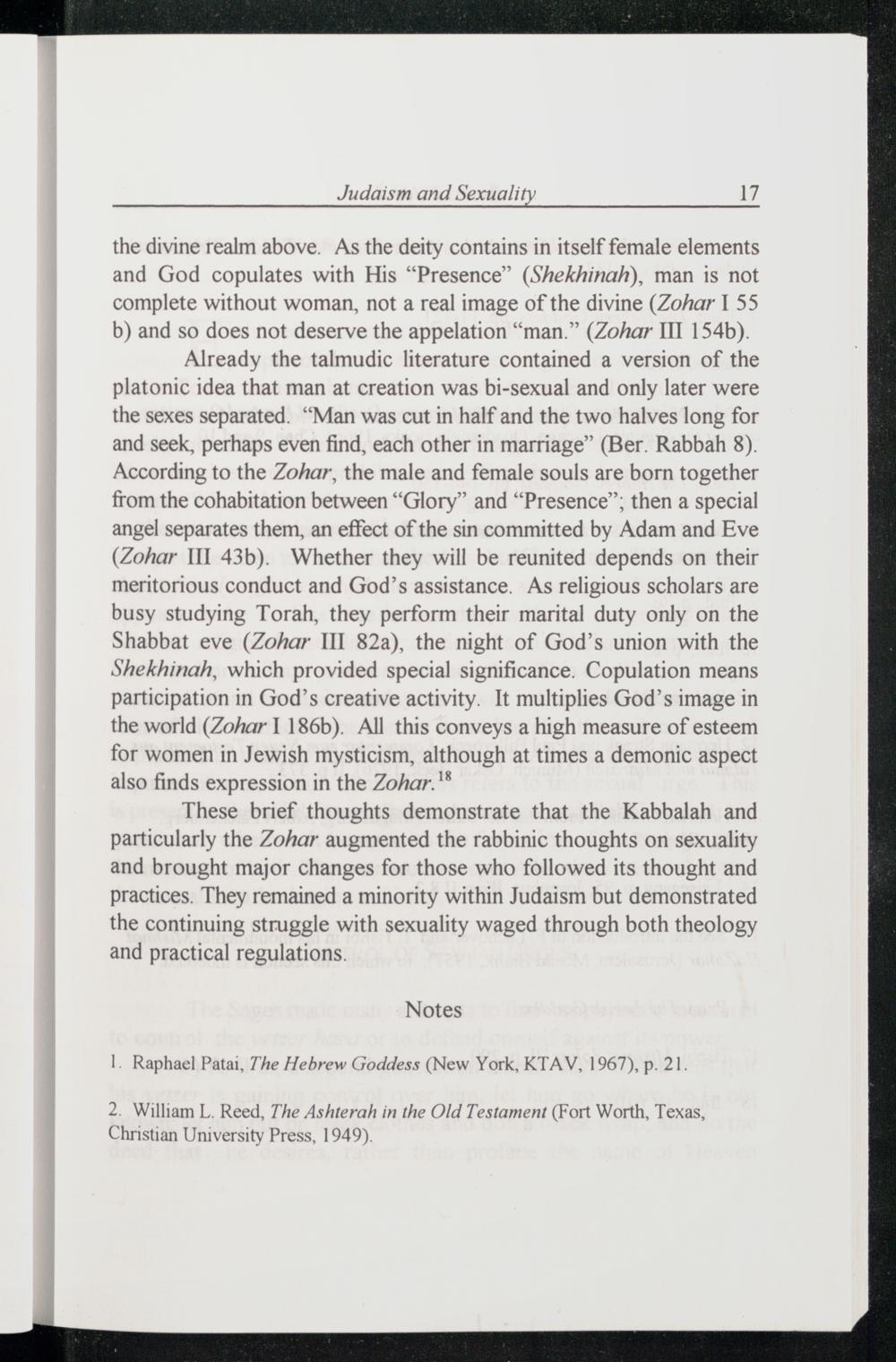Already the talmudic literature contained a version of the platonic idea that man at creation was bi-sexual and only later were the sexes separated.“Man was cut in half and the two halves long for and seek, perhaps even find, each other in marriage”(Ber. Rabbah 8). According to the Zohar, the male and female souls are born together from the cohabitation between“Glory” and“Presence”; then a special angel separates them, an effect of the sin committed by Adam and Eve (Zohar 111 43b). Whether they will be reunited depends on their meritorious conduct and God ’s assistance. As religious scholars are busy studying Torah , they perform their marital duty only on the Shabbat eve(Zohar 111 82a), the night of God ’s union with the Shekhinah, which provided special significance. Copulation means participation in God ’s creative activity. It multiplies God ’s image in the world(Zohar 1 186b). All this conveys a high measure of esteem for women in Jewish mysticism, although at times a demonic aspect also finds expression in the Zohar."