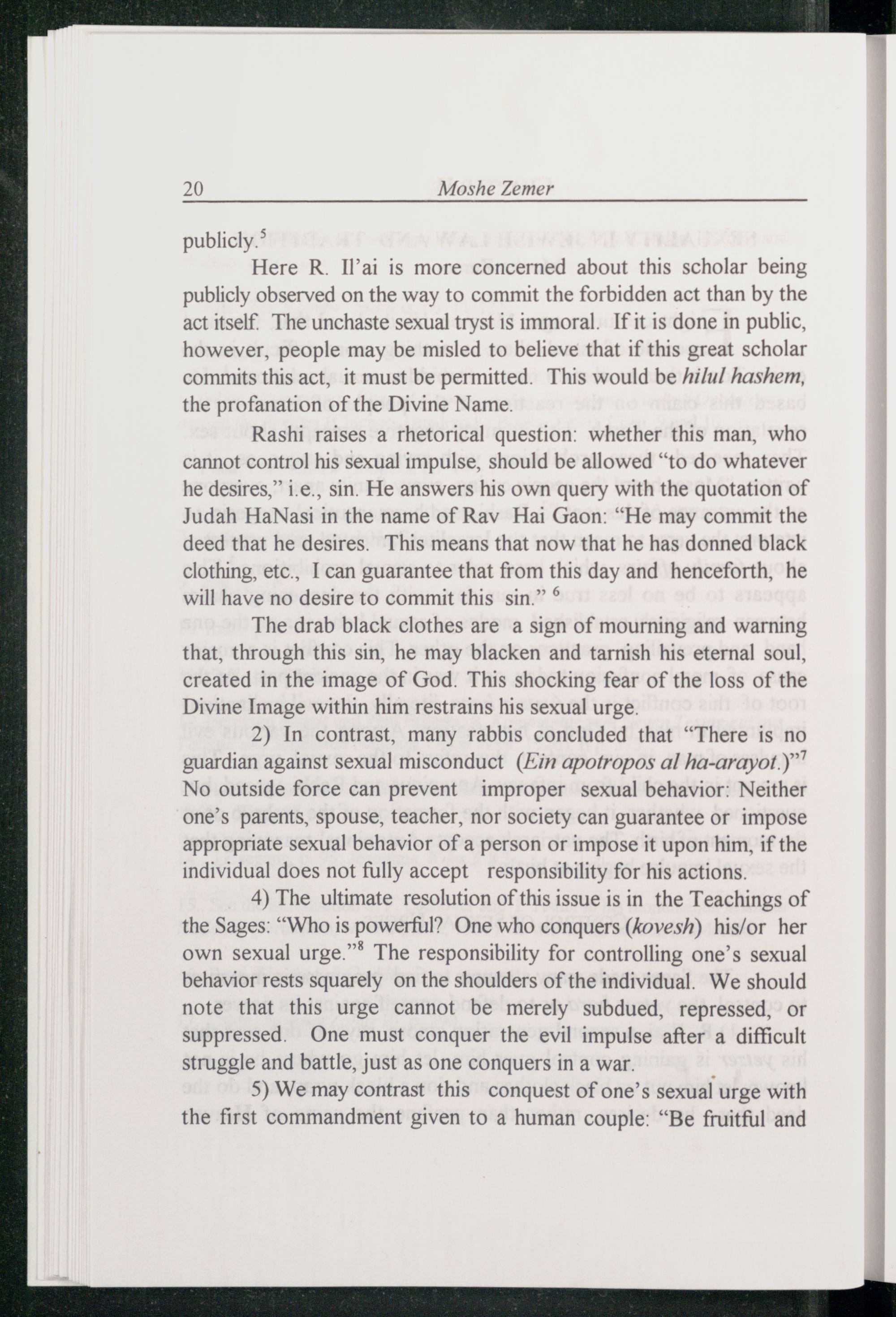 4) The ultimate resolution of this issue is in the Teachings of the Sages:“Who is powerful? One who conquers(kovesh) his/or her own sexual urge.”® The responsibility for controlling one’s sexual behavior rests squarely on the shoulders of the individual. We should note that this urge cannot be merely subdued, repressed, or suppressed. One must conquer the evil impulse after a difficult struggle and battle, just as one conquers in a war.: