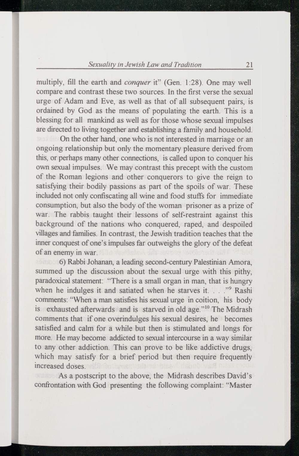 6) Rabbi Johanan, a leading second-century Palestinian Amora, summed up the discussion about the sexual urge with this pithy, paradoxical statement:“There is a small organ in man, that is hungry when he indulges it and satiated when he starves it....”° Rashi comments:“When a man satisfies his sexual urge in coition, his body is exhausted afterwards and is starved in old age.”'’ The Midrash comments that if one overindulges his sexual desires, he becomes satisfied and calm for a while but then is stimulated and longs for more. He may become addicted to sexual intercourse in a way similar to any other addiction. This can prove to be like addictive drugs, which may satisfy for a brief period but then require frequently increased doses.