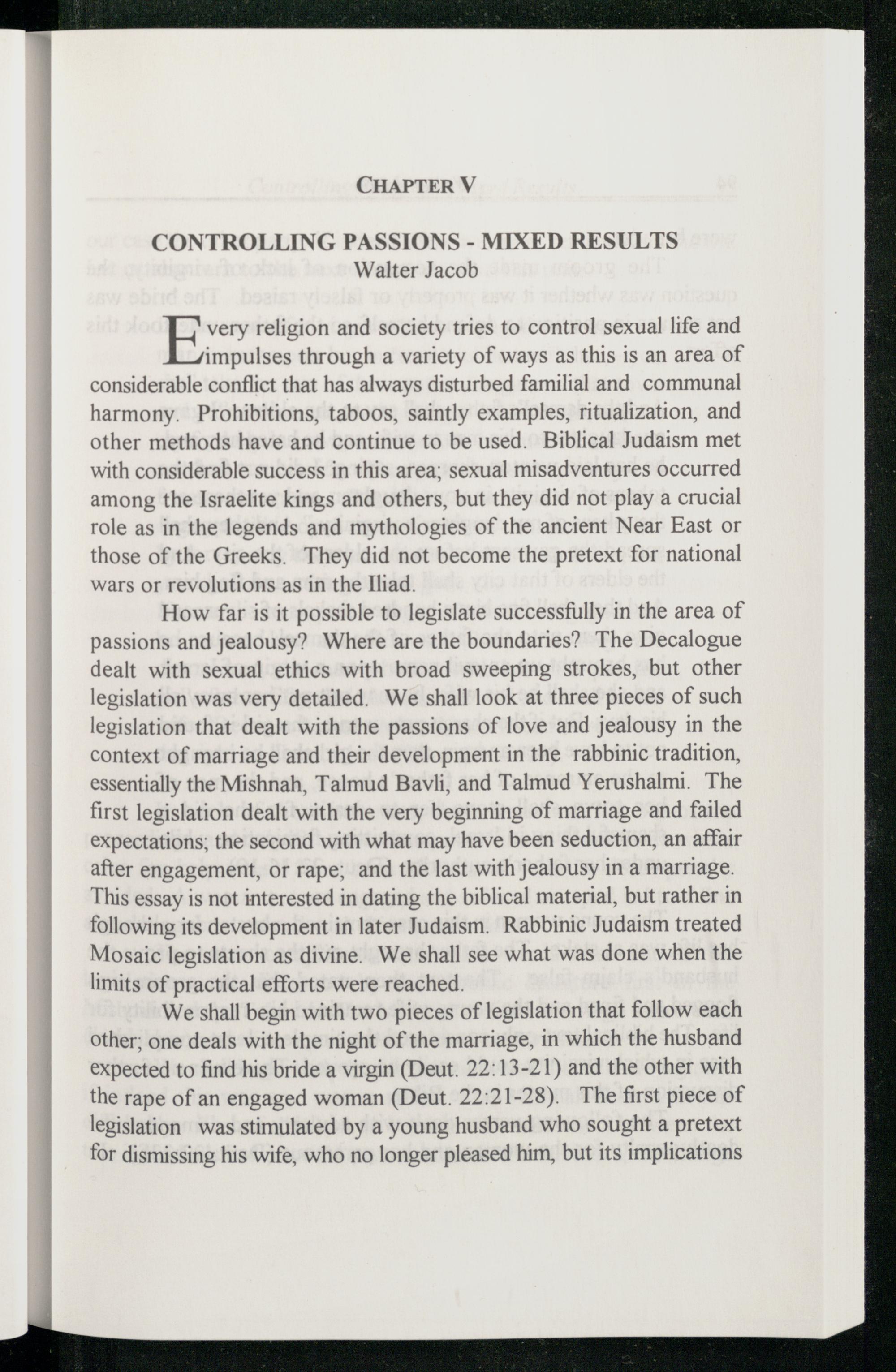 How far is it possible to legislate successfully in the area of passions and jealousy? Where are the boundaries? The Decalogue dealt with sexual ethics with broad sweeping strokes, but other legislation was very detailed. We shall look at three pieces of such legislation that dealt with the passions of love and jealousy in the context of marriage and their development in the rabbinic tradition, essentially the Mishnah, Talmud Bavli, and Talmud Yerushalmi. The first legislation dealt with the very beginning of marriage and failed expectations; the second with what may have been seduction, an affair after engagement, or rape; and the last with jealousy in a marriage. This essay is not interested in dating the biblical material, but rather in following its development in later Judaism . Rabbinic Judaism treated Mosaic legislation as divine. We shall see what was done when the limits of practical efforts were reached.