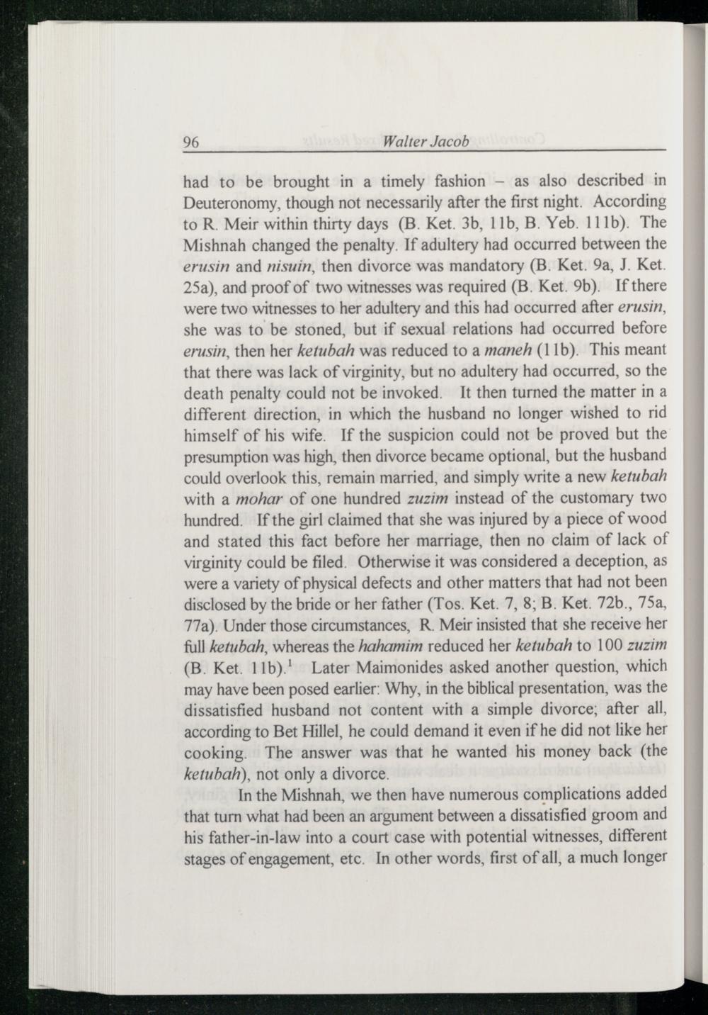 had to be brought in a timely fashion— as also described in Deuteronomy , though not necessarily after the first night. According to R. Meir within thirty days(B. Ket. 3b, 11b, B. Yeb. 111b). The Mishnah changed the penalty. If adultery had occurred between the erusin and nisuin, then divorce was mandatory(B. Ket. 9a, J. Ket. 25a), and proof of two witnesses was required(B. Ket. 9b). If there were two witnesses to her adultery and this had occurred after erusin, she was to be stoned, but if sexual relations had occurred before erusin, then her ketubah was reduced to a maneh(11b). This meant that there was lack of virginity, but no adultery had occurred, so the death penalty could not be invoked. It then turned the matter in a different direction, in which the husband no longer wished to rid himself of his wife. If the suspicion could not be proved but the presumption was high, then divorce became optional, but the husband could overlook this, remain married, and simply write a new ketubah with a mohar of one hundred zuzim instead of the customary two hundred. If the girl claimed that she was injured by a piece of wood and stated this fact before her marriage, then no claim of lack of virginity could be filed. Otherwise it was considered a deception, as were a variety of physical defects and other matters that had not been disclosed by the bride or her father(Tos. Ket. 7, 8; B. Ket. 72b., 75a, 77a). Under those circumstances, R. Meir insisted that she receive her full ketubah, whereas the hahamim reduced her ketubah to 100 zuzim (B. Ket. 11b).! Later Maimonides asked another question, which may have been posed earlier: Why, in the biblical presentation, was the dissatisfied husband not content with a simple divorce; after all, according to Bet Hillel, he could demand it even if he did not like her cooking. The answer was that he wanted his money back(the ketubah), not only a divorce.