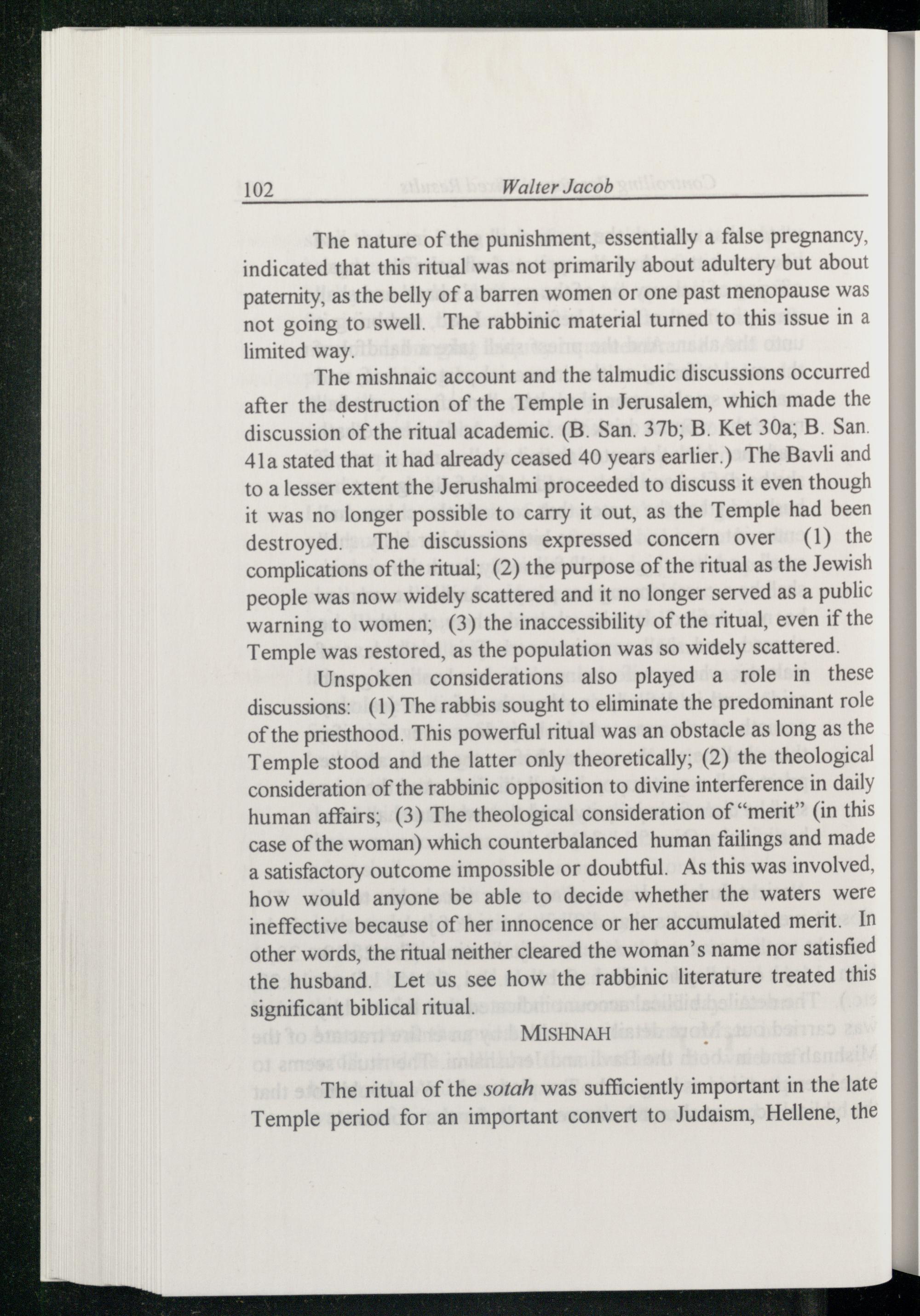 Unspoken considerations also played a role in these discussions:(1) The rabbis sought to eliminate the predominant role of the priesthood. This powerful ritual was an obstacle as long as the Temple stood and the latter only theoretically;(2) the theological consideration of the rabbinic opposition to divine interference in daily human affairs;(3) The theological consideration of“merit”(in this case of the woman) which counterbalanced human failings and made a satisfactory outcome impossible or doubtful. As this was involved, how would anyone be able to decide whether the waters were ineffective because of her innocence or her accumulated merit. In other words, the ritual neither cleared the woman’s name nor satisfied the husband. Let us see how the rabbinic literature treated this significant biblical ritual.
