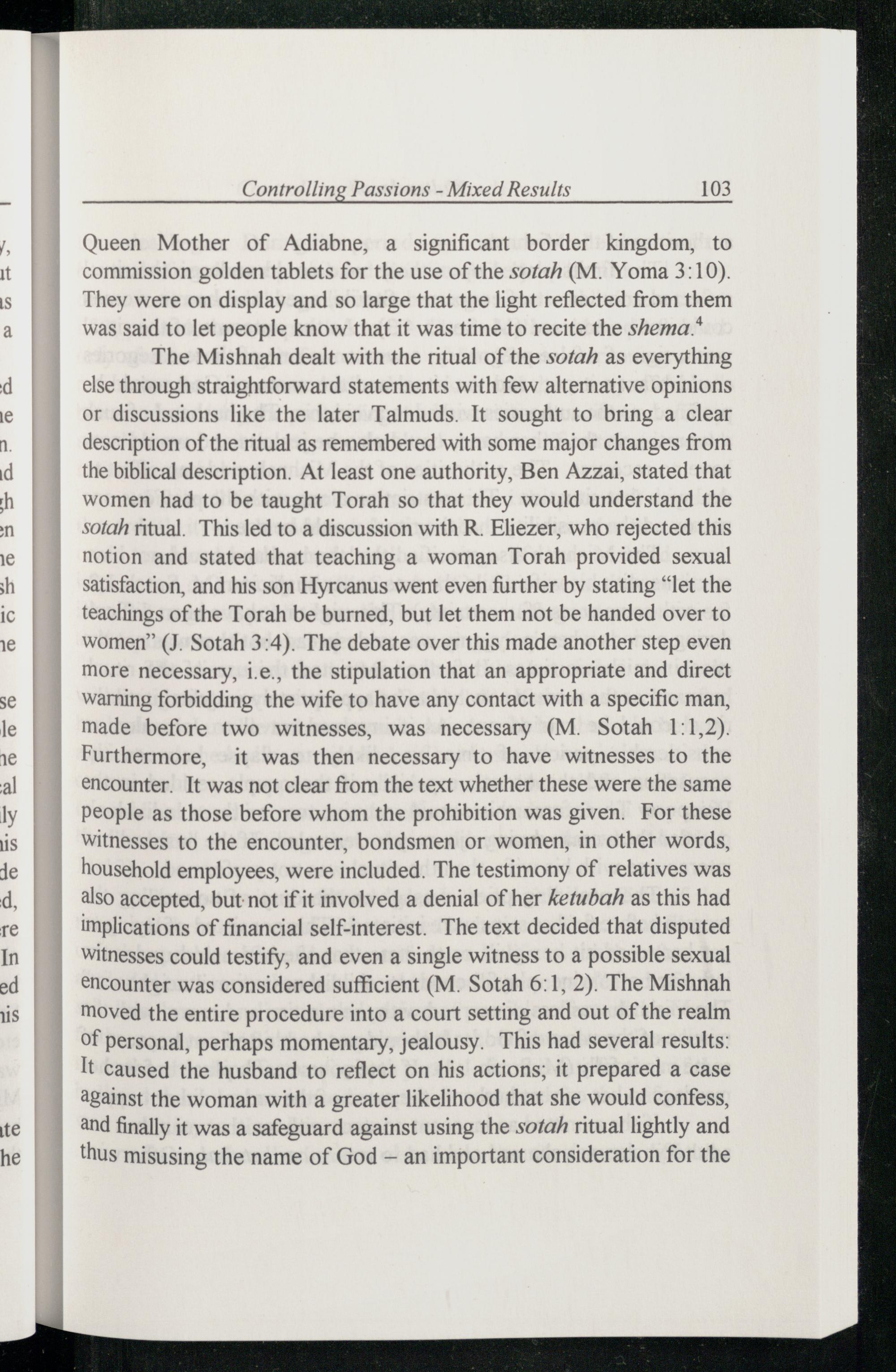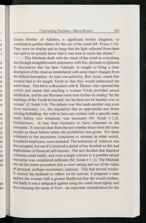 Queen Mother of Adiabne, a significant border kingdom, to commission golden tablets for the use of the sotah(M. Yoma 3:10). They were on display and so large that the light reflected from them was said to let people know that it was time to recite the shema.* The Mishnah dealt with the ritual of the sotah as everything else through straightforward statements with few alternative opinions or discussions like the later Talmuds . It sought to bring a clear description of the ritual as remembered with some major changes from the biblical description. At least one authority, Ben Azzai , stated that women had to be taught Torah so that they would understand the sotah ritual. This led to a discussion with R. Eliezer, who rejected this notion and stated that teaching a woman Torah provided sexual satisfaction, and his son Hyrcanus went even further by stating“let the teachings of the Torah be burned, but let them not be handed over to women”(J. Sotah 3:4). The debate over this made another step even more necessary, i.e., the stipulation that an appropriate and direct warning forbidding the wife to have any contact with a specific man, made before two witnesses, was necessary(M. Sotah 1:1,2). Furthermore, it was then necessary to have witnesses to the encounter. It was not clear from the text whether these were the same people as those before whom the prohibition was given. For these witnesses to the encounter, bondsmen or women, in other words, household employees, were included. The testimony of relatives was also accepted, but not if it involved a denial of her ketubah as this had implications of financial self-interest. The text decided that disputed witnesses could testify, and even a single witness to a possible sexual encounter was considered sufficient(M. Sotah 6:1, 2). The Mishnah moved the entire procedure into a court setting and out of the realm of personal, perhaps momentary, jealousy. This had several results: It caused the husband to reflect on his actions; it prepared a case against the woman with a greater likelihood that she would confess, and finally it was a safeguard against using the sotah ritual lightly and thus misusing the name of God — an important consideration for the