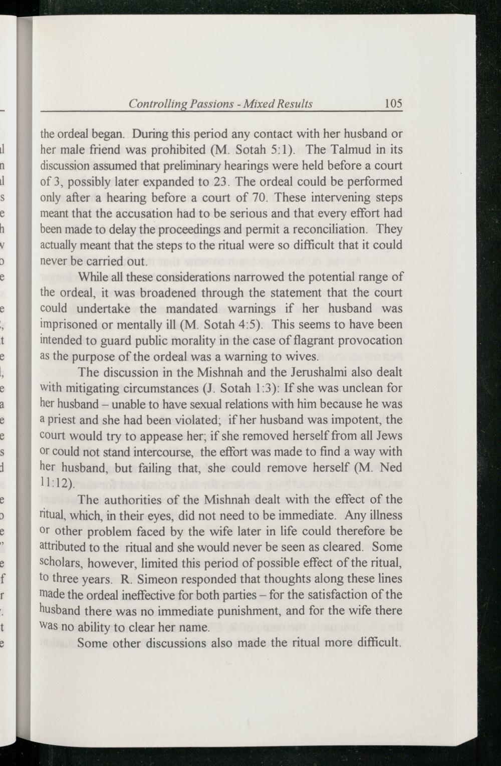 The authorities of the Mishnah dealt with the effect of the ritual, which, in their eyes, did not need to be immediate. Any illness or other problem faced by the wife later in life could therefore be attributed to the ritual and she would never be seen as cleared. Some scholars, however, limited this period of possible effect of the ritual, to three years. R. Simeon responded that thoughts along these lines made the ordeal ineffective for both parties— for the satisfaction of the husband there was no immediate punishment, and for the wife there Was no ability to clear her name.