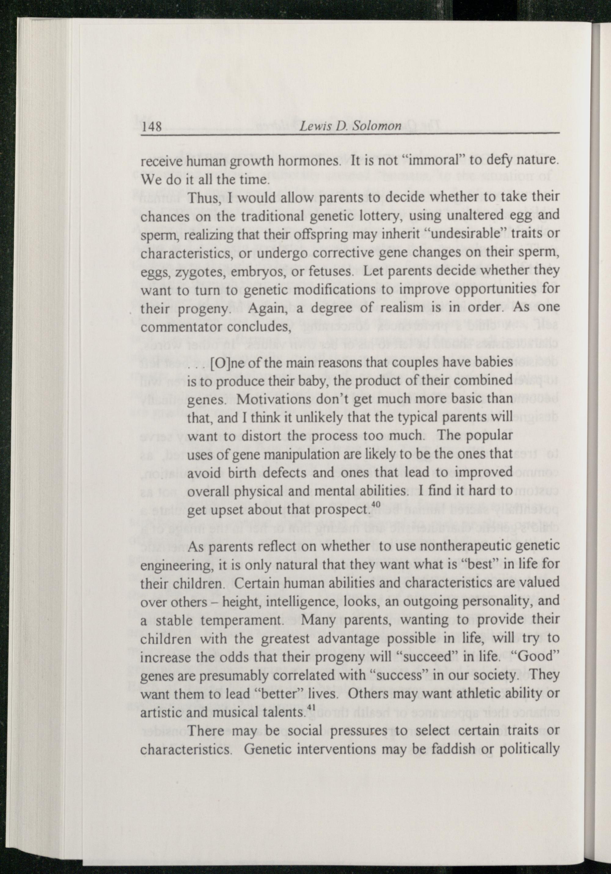 As parents reflect on whether to use nontherapeutic genetic engineering, it is only natural that they want what is“best” in life for their children. Certain human abilities and characteristics are valued over others— height, intelligence, looks, an outgoing personality, and a stable temperament. Many parents, wanting to provide their children with the greatest advantage possible in life, will try to increase the odds that their progeny will“succeed” in life.“Good” genes are presumably correlated with“success” in our society. They want them to lead“better” lives. Others may want athletic ability or artistic and musical talents.*!
