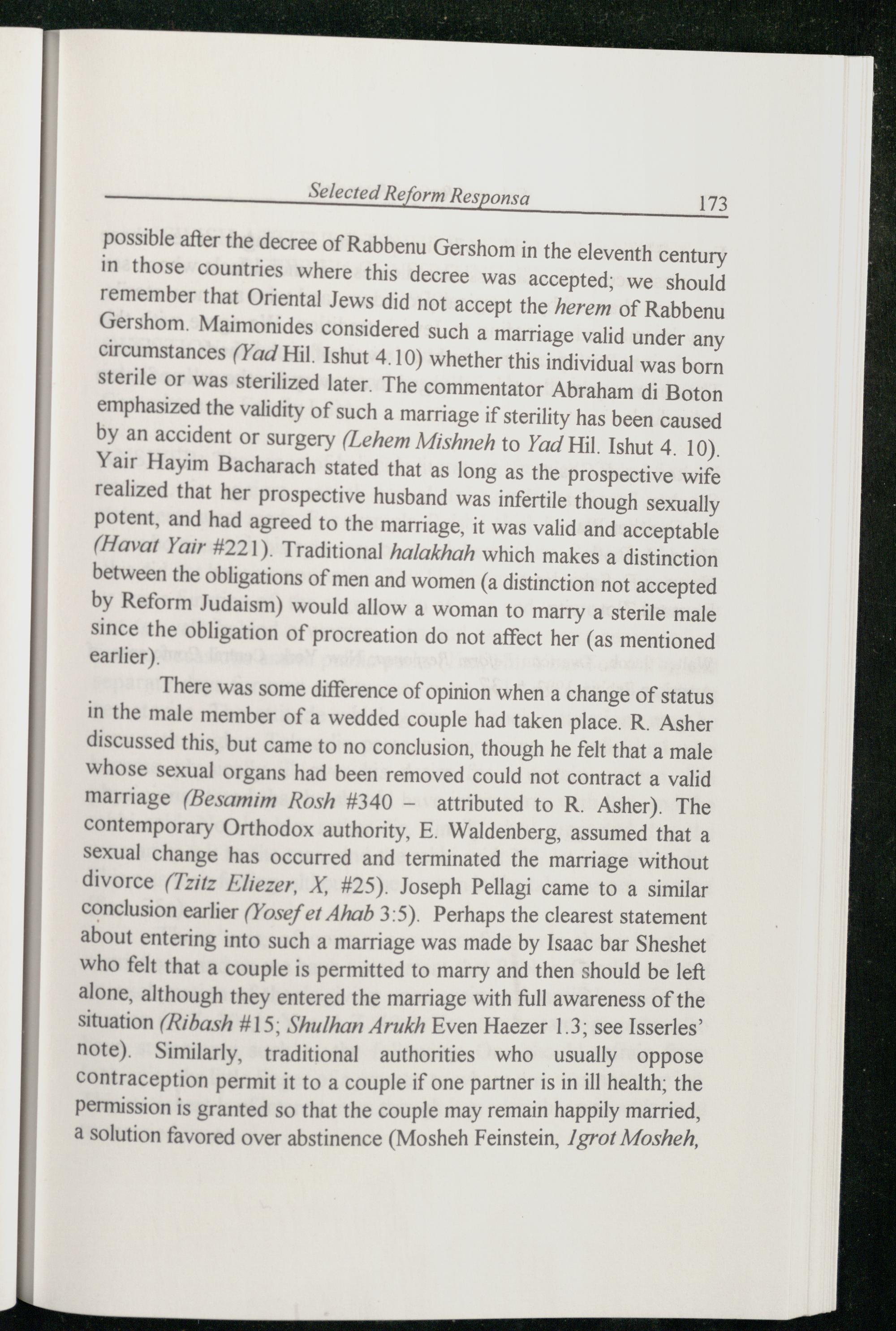 There was some difference of opinion when a change of status in the male member of a wedded couple had taken place. R. Asher discussed this, but came to no conclusion, though he felt that a male whose sexual organs had been removed could not contract a valid marriage(Besamim Rosh#340— attributed to R. Asher). The contemporary Orthodox authority, E. Waldenberg, assumed that a sexual change has occurred and terminated the marriage without divorce(7zitz Eliezer, X,#25). Joseph Pellagi came to a similar conclusion earlier(Yosef et Ahab 3:5). Perhaps the clearest statement about entering into such a marriage was made by Isaac bar Sheshet who felt that a couple is permitted to marry and then should be left alone, although they entered the marriage with full awareness of the situation(Ribash#15; Shulhan Arukh Even Haezer 1.3; see Isserles ’ note). Similarly, traditional authorities who usually oppose contraception permit it to a couple if one partner is in ill health; the permission is granted so that the couple may remain happily married, a solution favored over abstinence(Mosheh Feinstein, /grot Mosheh,