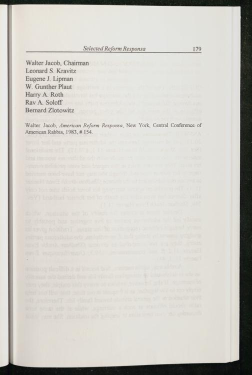 Selected Reform Responsa 179 Walter Jacob, Chairman Leonard S. Kravitz Eugene J. Lipman W. Gunther Plaut Harry A. Roth Rav A. Soloff Bernard Zlotowitz Walter Jacob , American Reform Responsa, New York , Central Conference of American Rabbis, 1983,# 154.