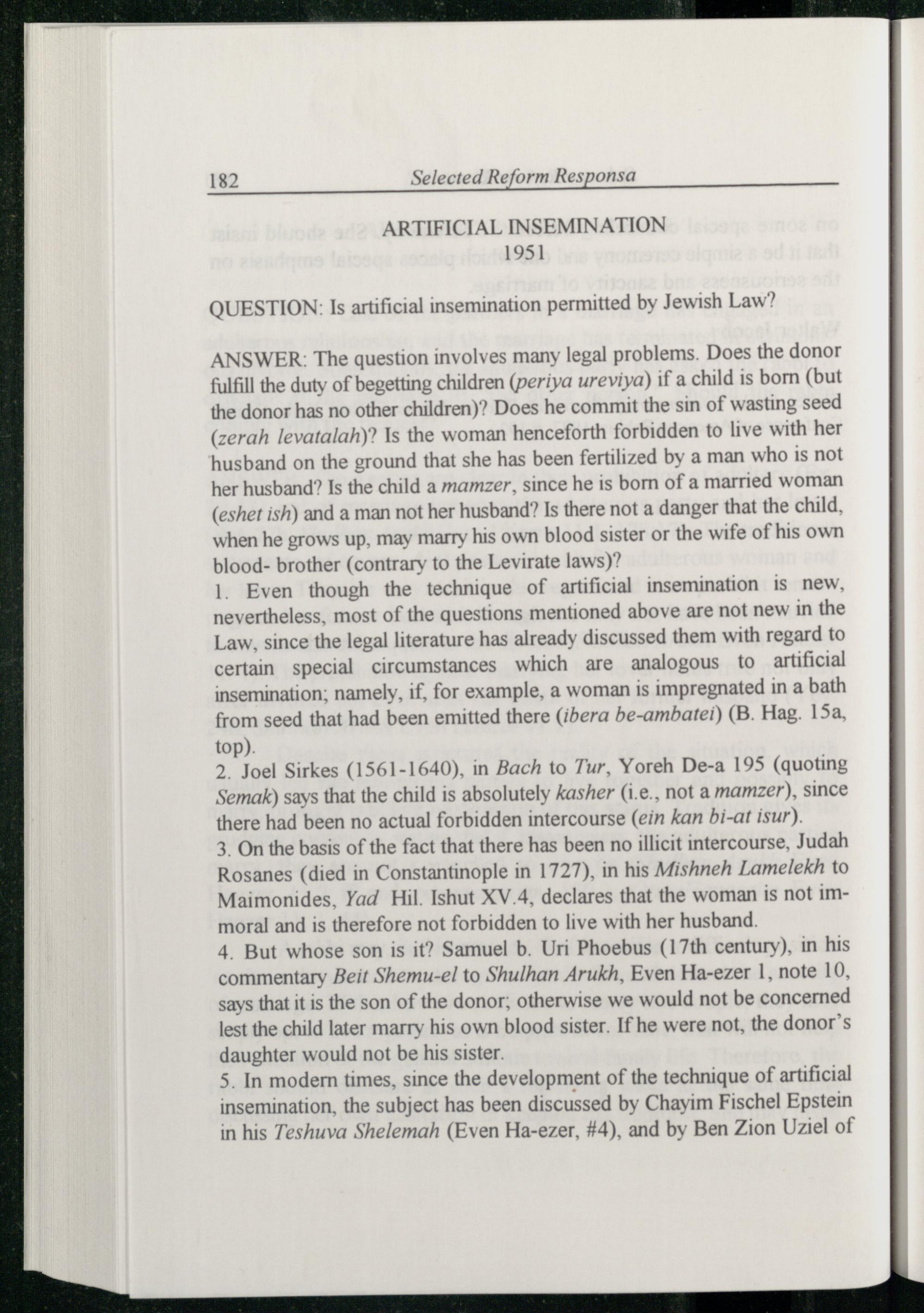 5. In modem times, since the development of the technique of artificial insemination, the subject has been discussed by Chayim Fischel Epstein in his Teshuva Shelemah(Even Ha-ezer,#4), and by Ben Zion Uziel of