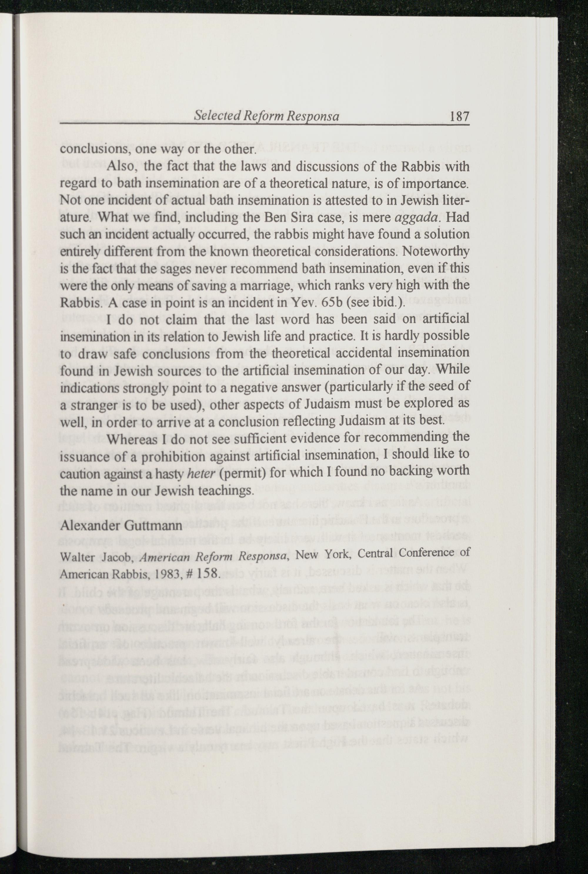 I do not claim that the last word has been said on artificial insemination in its relation to Jewish life and practice. It is hardly possible to draw safe conclusions from the theoretical accidental insemination found in Jewish sources to the artificial insemination of our day. While indications strongly point to a negative answer(particularly if the seed of a stranger is to be used), other aspects of Judaism must be explored as well, in order to arrive at a conclusion reflecting Judaism at its best.