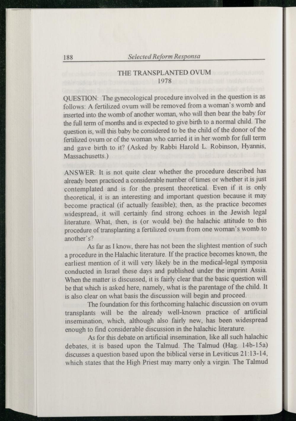 QUESTION: The gynecological procedure involved in the question is as follows: A fertilized ovum will be removed from a woman’s womb and inserted into the womb of another woman, who will then bear the baby for the full term of months and is expected to give birth to a normal child. The question is, will this baby be considered to be the child of the donor of the fertilized ovum or of the woman who carried it in her womb for full term and gave birth to it?(Asked by Rabbi Harold L. Robinson, Hyannis , Massachusetts .)