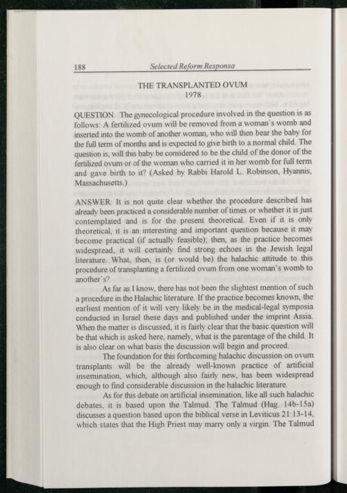 ANSWER: It is not quite clear whether the procedure described has already been practiced a considerable number of times or whether it is just contemplated and is for the present theoretical. Even if it is only theoretical, it is an interesting and important question because it may become practical(if actually feasible); then, as the practice becomes widespread, it will certainly find strong echoes in the Jewish legal literature. What. then, is(or would be) the halachic attitude to this procedure of transplanting a fertilized ovum from one woman’s womb to anothers?
