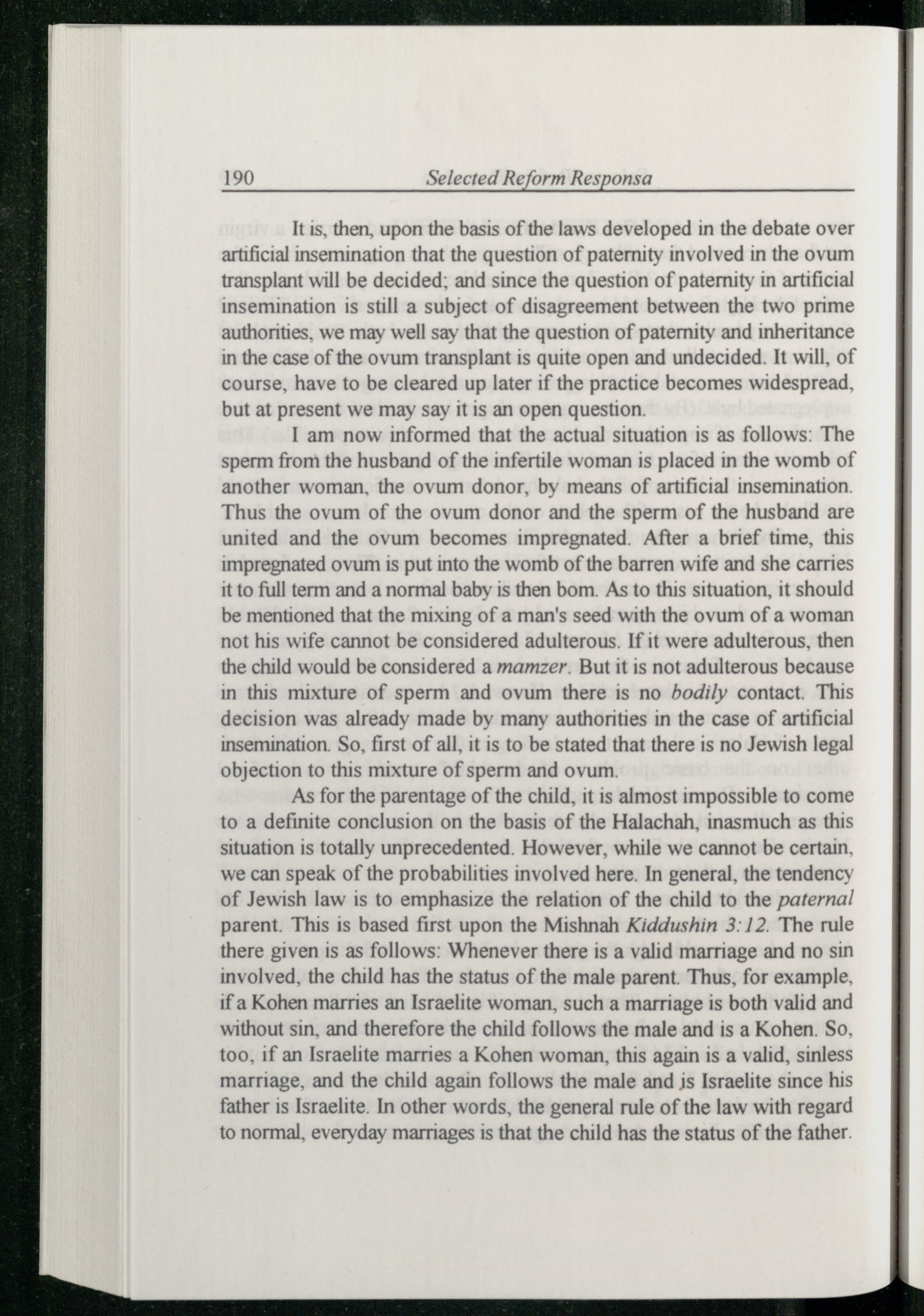 I am now informed that the actual situation is as follows: The sperm from the husband of the infertile woman is placed in the womb of another woman, the ovum donor, by means of artificial insemination. Thus the ovum of the ovum donor and the sperm of the husband are united and the ovum becomes impregnated. After a brief time, this impregnated ovum is put into the womb of the barren wife and she carries it to full term and a normal baby is then bom. As to this situation, it should be mentioned that the mixing of a man's seed with the ovum of a woman not his wife cannot be considered adulterous. If it were adulterous, then the child would be considered a mamzer. But it is not adulterous because in this mixture of sperm and ovum there is no bodily contact. This decision was already made by many authorities in the case of artificial insemination. So, first of all, it is to be stated that there is no Jewish legal objection to this mixture of sperm and ovum.