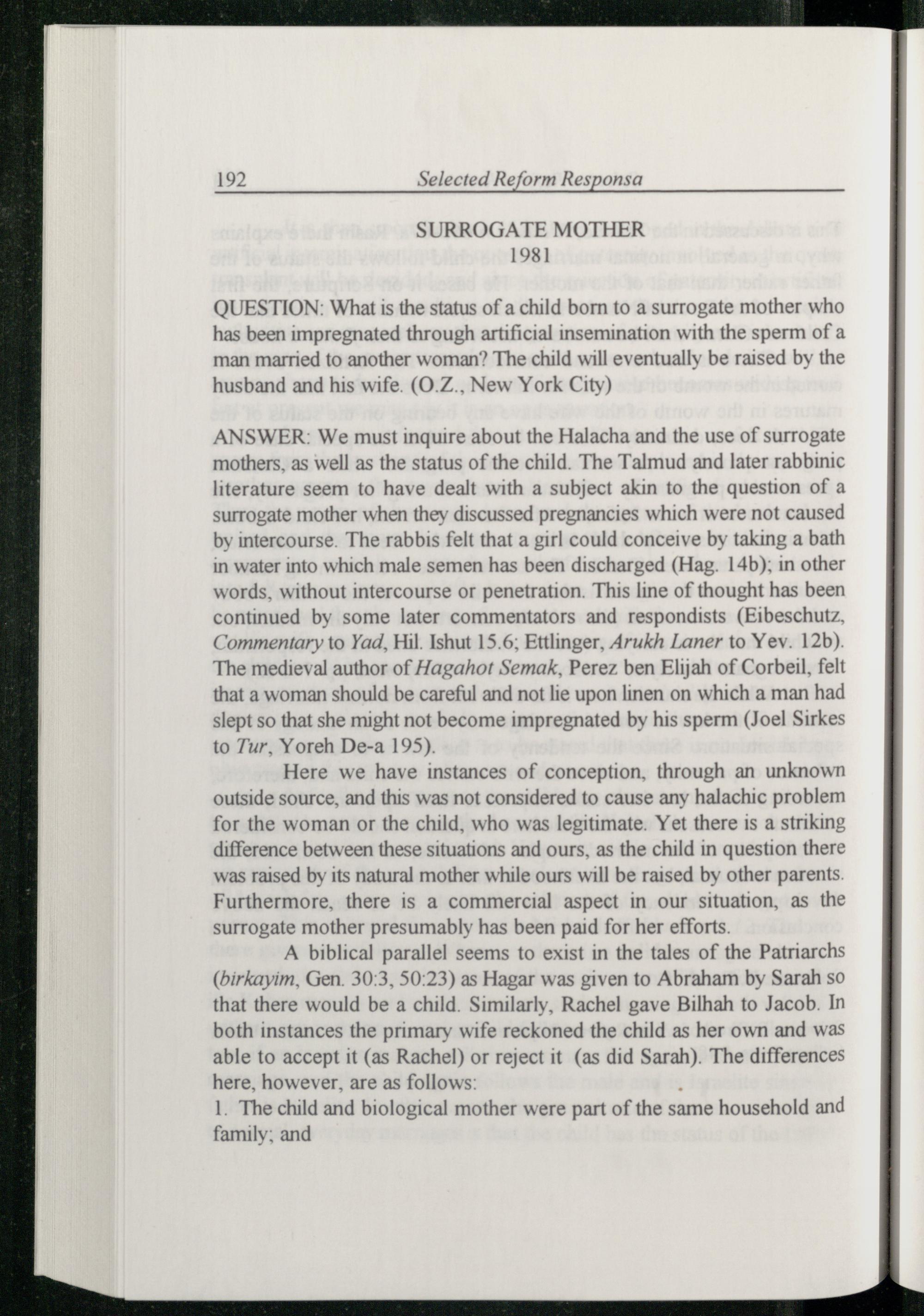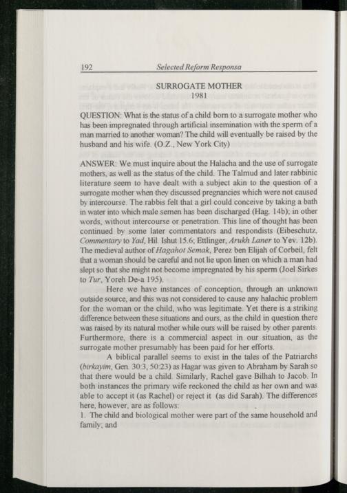 ANSWER: We must inquire about the Halacha and the use of surrogate mothers, as well as the status of the child. The Talmud and later rabbinic literature seem to have dealt with a subject akin to the question of a surrogate mother when they discussed pregnancies which were not caused by intercourse. The rabbis felt that a girl could conceive by taking a bath in water into which male semen has been discharged(Hag. 14b); in other words, without intercourse or penetration. This line of thought has been continued by some later commentators and respondists(Eibeschutz, Commentary to Yad, Hil. Ishut 15.6; Ettlinger, 4rukh Laner to Yev. 12b). The medieval author of Hagahot Semak, Perez ben Elijah of Corbeil, felt that a woman should be careful and not lie upon linen on which a man had slept so that she might not become impregnated by his sperm(Joel Sirkes to Tur, Yoreh De-a 195).