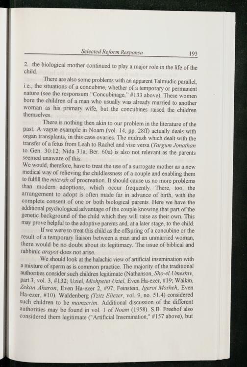 There is nothing then akin to our problem in the literature of the past. A vague example in Noam(vol. 14, pp. 28f) actually deals with organ transplants, in this case ovaries. The midrash which dealt with the transfer of a fetus from Leah to Rachel and vise versa(Targum Jonathan to Gen. 30:12; Nida 31a; Ber. 60a) is also not relevant as the parents seemed unaware of this.