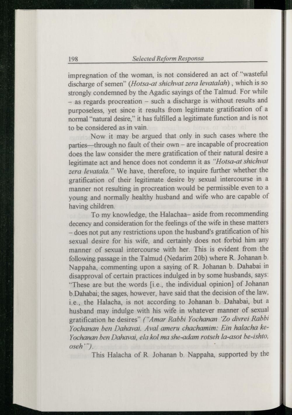 impregnation of the woman, is not considered an act of“wasteful discharge of semen”(Hotsa-at shichvat zera levatalah), which is so strongly condemned by the Agadic sayings of the Talmud . For while ~ as regards procreation— such a discharge is without results and purposeless, yet since it results from legitimate gratification of a normal“natural desire,” it has fulfilled a legitimate function and is not to be considered as in vain.