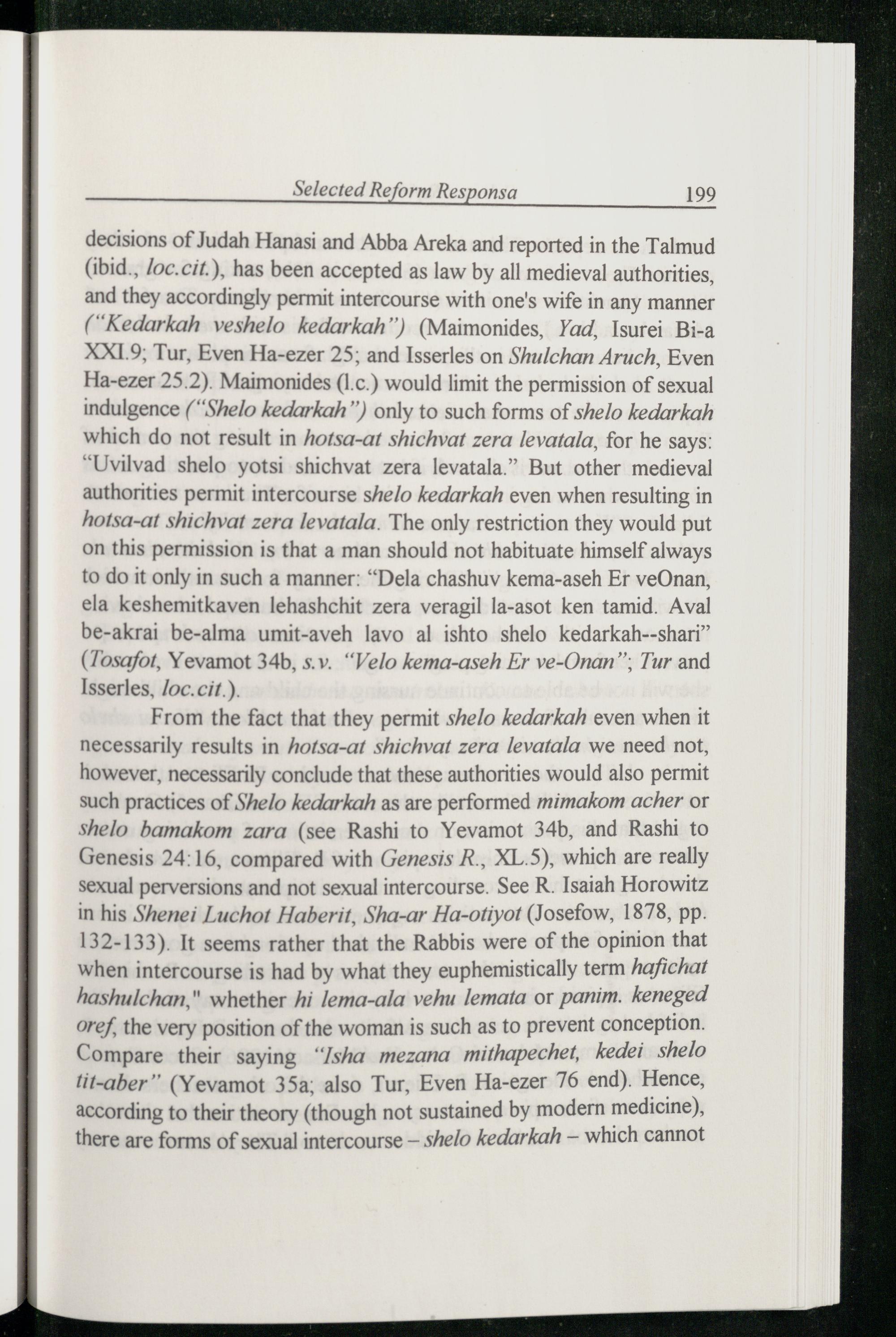 decisions of Judah Hanasi and Abba Areka and reported in the Talmud (ibid., loc.cit .), has been accepted as law by all medieval authorities, and they accordingly permit intercourse with one's wife in any manner (“Kedarkah veshelo kedarkah”)(Maimonides , Yad, Isurei Bi-a XXI1.9; Tur, Even Ha-ezer 25; and Isserles on Shulchan Aruch, Even Ha-ezer 25.2). Maimonides (1.c.) would limit the permission of sexual indulgence(“Shelo kedarkah”) only to such forms of shelo kedarkah which do not result in hotsa-at shichvat zera levatala, for he says: “Uvilvad shelo yotsi shichvat zera levatala.” But other medieval authorities permit intercourse shelo kedarkah even when resulting in hotsa-at shichvat zera levatala. The only restriction they would put on this permission is that a man should not habituate himself always to do it only in such a manner:“Dela chashuv kema-aseh Er veOnan, ela keshemitkaven lehashchit zera veragil la-asot ken tamid. Aval be-akrai be-alma umit-aveh lavo al ishto shelo kedarkah--shari” (Tosafot, Yevamot 34b, s.v.“Velo kema-aseh Er ve-Onan’’; Tur and Isserles , loc.cit.).