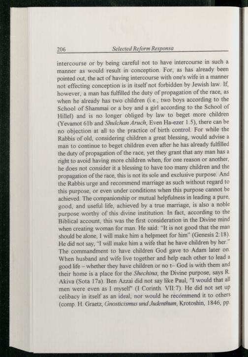 intercourse or by being careful not to have intercourse in such a manner as would result in conception. For, as has already been pointed out, the act of having intercourse with one's wife in a manner not effecting conception is in itself not forbidden by Jewish law. If, however, a man has fulfilled the duty of propagation of the race, as when he already has two children(i.e., two boys according to the School of Shammai or a boy and a girl according to the School of Hillel) and is no longer obliged by law to beget more children (Yevamot 61b and Shulchan Aruch, Even Ha-ezer 1.5), there can be no objection at all to the practice of birth control. For while the Rabbis of old, considering children a great blessing, would advise a man to continue to beget children even after he has already fulfilled the duty of propagation of the race, yet they grant that any man has a right to avoid having more children when, for one reason or another, he does not consider it a blessing to have too many children and the propagation of the race, this is not its sole and exclusive purpose. And the Rabbis urge and recommend marriage as such without regard to this purpose, or even under conditions when this purpose cannot be achieved. The companionship or mutual helpfulness in leading a pure, good, and useful life, achieved by a true marriage, is also a noble purpose worthy of this divine institution. In fact, according to the Biblical account, this was the first consideration in the Divine mind when creating woman for man. He said:“It is not good that the man should be alone, I will make him a helpmeet for him”(Genesis 2:18). He did not say,“I will make him a wife that he have children by her.” The commandment to have children God gave to Adam later on. When husband and wife live together and help each other to lead a good life— whether they have children or no t— God is with them and their home is a place for the Shechina, the Divine purpose, says R. Akiva (Sota 17a). Ben Azzai did not say like Paul,"I would that all men were even as I myself"(I Corinth. VII:7). He did not set up celibacy in itself as an ideal, nor would he recommend it to others (comp. H. Graetz , Gnosticismus und Judenthum, Krotoshin, 1846, pp.