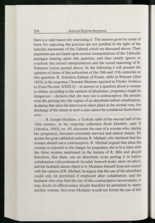 there is a valid reason for exercising it. The reasons given by some of them for opposing the practice are not justified in the light of the halachic statements of the Talmud which we discussed above. Their arguments are not based upon correct interpretations of the Talmudic passages bearing upon this question, and they utterly ignore or overlook the correct interpretations and the sound reasoning of R. Solomon Lurya quoted above. In the following I will present the opinions of some of the authorities of the 18th and 19th centuries on this question. R. Solomon Zalman of Posen, rabbi in Warsaw(died 1839), in his responsa Chemdat Shelomo(quoted in Pitchei Teshuva to Even Ha-ezer XXII1.2)— in answer to a question about a woman to whom, according to the opinion of physicians, pregnancy might be dangerous— declares that she may use a contraceptive. He permits even the putting into the vagina of an absorbent before cohabitation, declaring that since the intercourse takes place in the normal way, the discharge of the semen in such a case cannot be considered hashchatat zera.