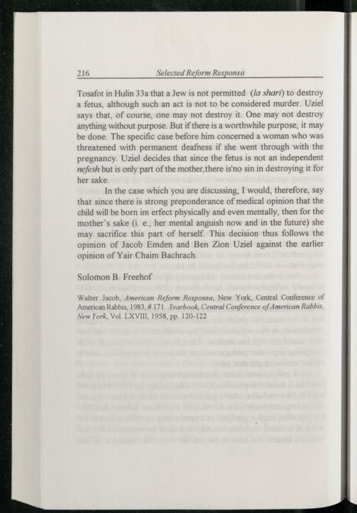 Tosafot in Hulin 33a that a Jew is not permitted(/a shari) to destroy a fetus, although such an act is not to be considered murder. Uziel says that, of course, one may not destroy it. One may not destroy anything without purpose. But if there is a worthwhile purpose, it may be done. The specific case before him concerned a woman who was threatened with permanent deafness if she went through with the pregnancy. Uziel decides that since the fetus is not an independent nefesh but is only part of the mother, there is'no sin in destroying it for her sake