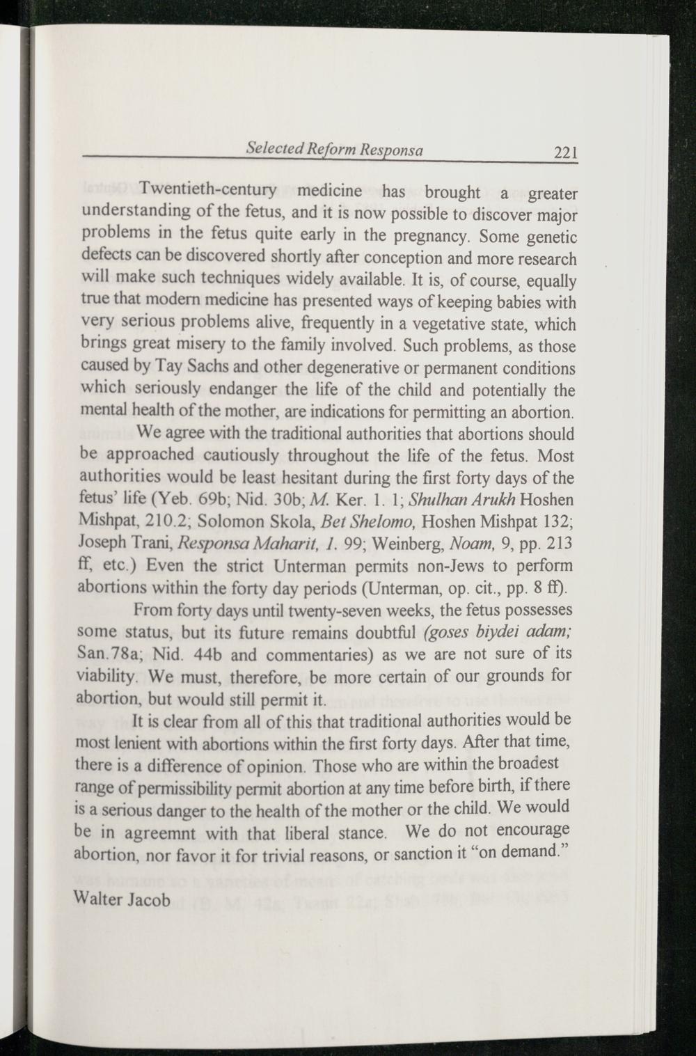 We agree with the traditional authorities that abortions should be approached cautiously throughout the life of the fetus. Most authorities would be least hesitant during the first forty days of the fetus’ life(Yeb. 69b; Nid. 30b; M. Ker. 1. 1; Shulhan Arukh Hoshen Mishpat, 210.2; Solomon Skola, Bet Shelomo, Hoshen Mishpat 132; Joseph Trani , Responsa Maharit, 1. 99; Weinberg, Noam, 9, pp. 213 ff, etc.) Even the strict Unterman permits non-Jews to perform abortions within the forty day periods(Unterman, op. cit., pp. 8 ff).