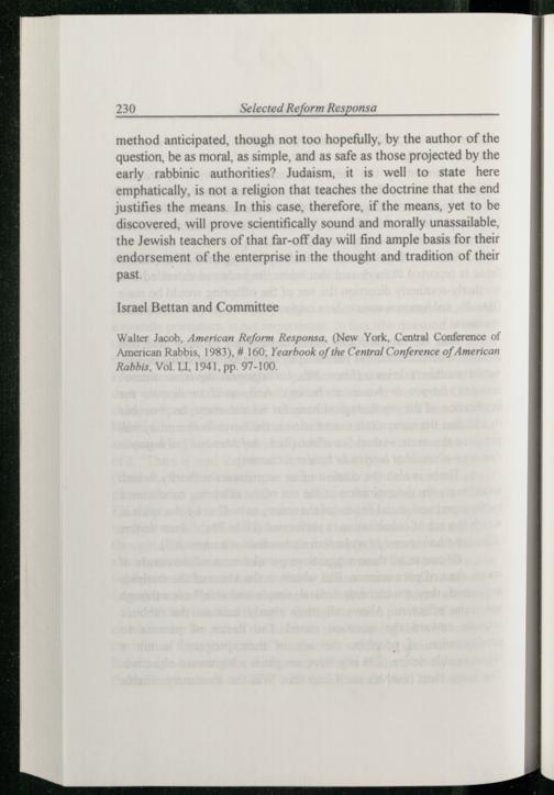 method anticipated, though not too hopefully, by the author of the question, be as moral, as simple, and as safe as those projected by the early rabbinic authorities? Judaism , it is well to state here emphatically, is not a religion that teaches the doctrine that the end justifies the means. In this case, therefore, if the means, yet to be discovered, will prove scientifically sound and morally unassailable, the Jewish teachers of that far-off day will find ample basis for their endorsement of the enterprise in the thought and tradition of their past
