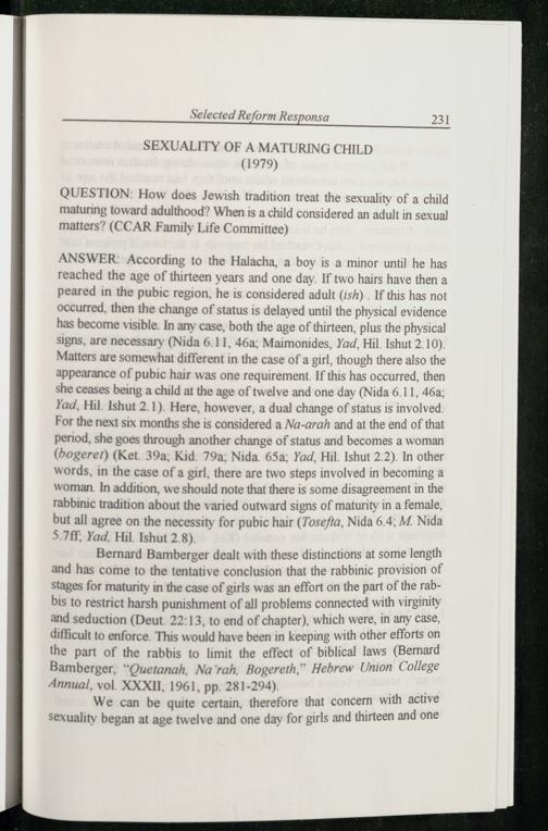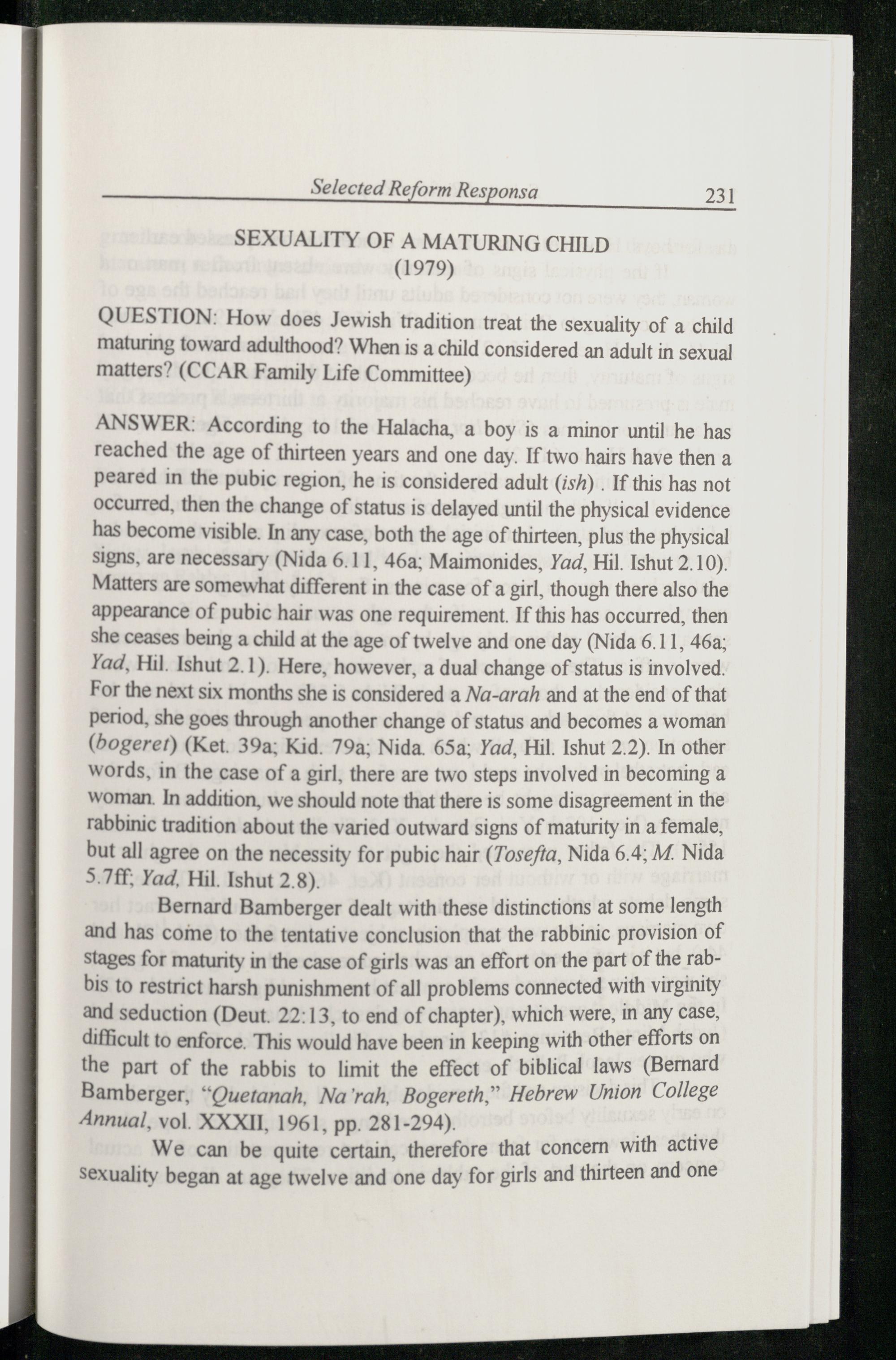 QUESTION: How does Jewish tradition treat the sexuality of a child maturing toward adulthood? When is a child considered an adult in sexual matters?(CCAR Family Life Committee)