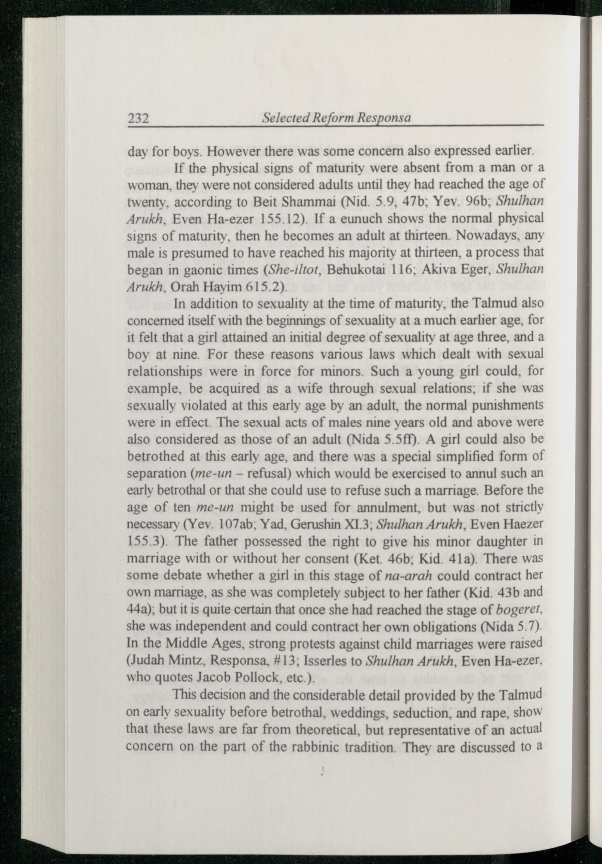 In addition to sexuality at the time of maturity, the Talmud also concerned itself with the beginnings of sexuality at a much earlier age, for it felt that a girl attained an initial degree of sexuality at age three, and a boy at nine. For these reasons various laws which dealt with sexual relationships were in force for minors. Such a young girl could, for example, be acquired as a wife through sexual relations; if she was sexually violated at this early age by an adult, the normal punishments were in effect. The sexual acts of males nine years old and above were also considered as those of an adult(Nida 5.5ff). A girl could also be betrothed at this early age, and there was a special simplified form of separation(me-un— refusal) which would be exercised to annul such an early betrothal or that she could use to refuse such a marriage. Before the age of ten me-un might be used for annulment, but was not strictly necessary(Yev. 107ab; Yad, Gerushin XI.3; Shulhan Arukh, Even Haezer 155.3). The father possessed the right to give his minor daughter in marriage with or without her consent(Ket. 46b; Kid . 41a). There was some debate whether a girl in this stage of na-arah could contract her own marriage, as she was completely subject to her father(Kid . 43b and 44a); but it is quite certain that once she had reached the stage of hogeref, she was independent and could contract her own obligations(Nida 5.7). In the Middle Ages, strong protests against child marriages were raised (Judah Mintz, Responsa,#13; Isserles to Shulhan Arukh, Even Ha-ezer, who quotes Jacob Pollock, etc.).