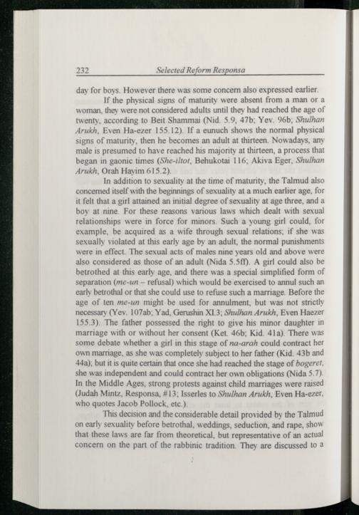 This decision and the considerable detail provided by the Talmud on early sexuality before betrothal, weddings, seduction, and rape, show that these laws are far from theoretical, but representative of an actual concern on the part of the rabbinic tradition. They are discussed to a