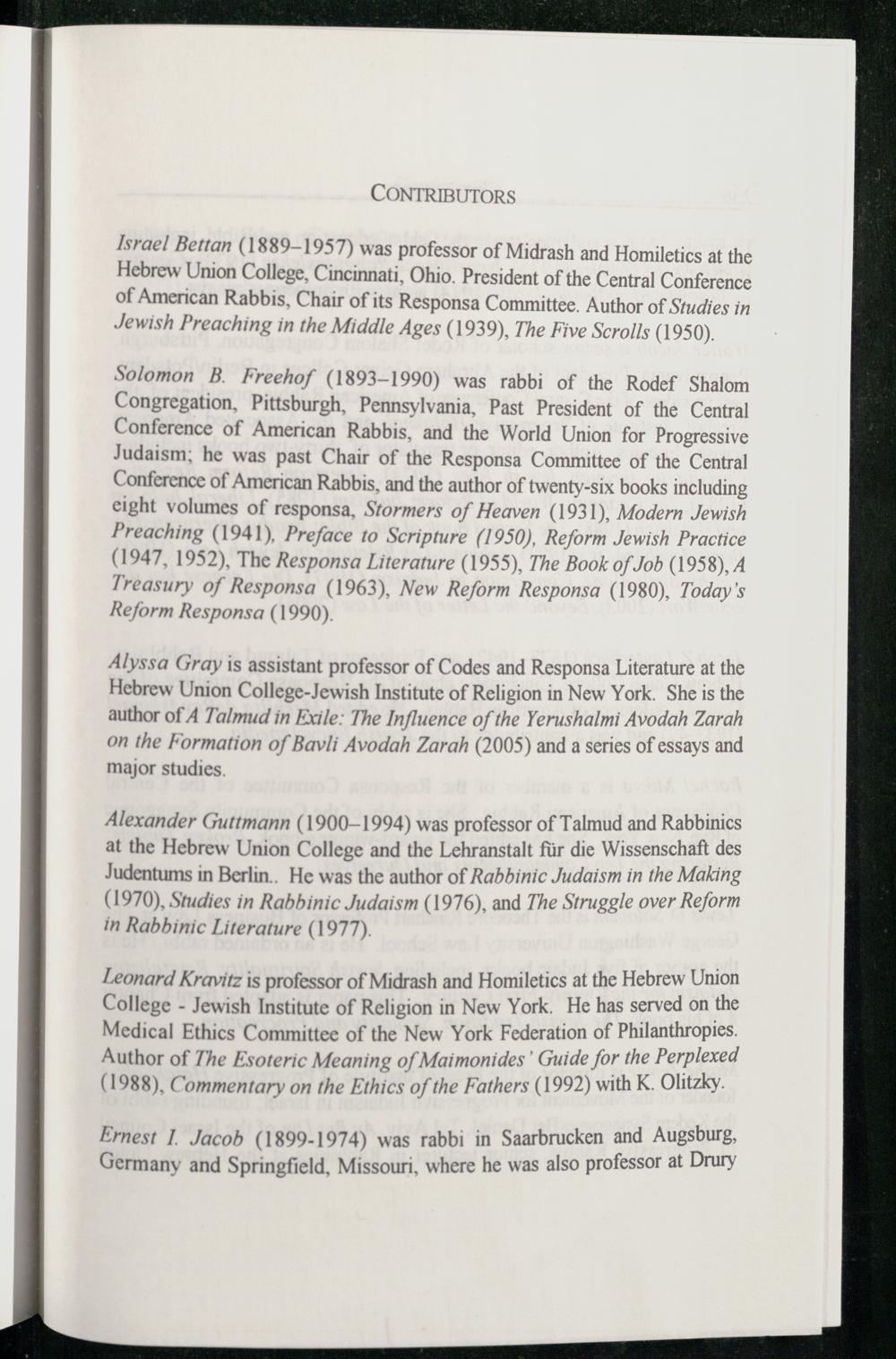 Solomon B. Freehof (1893-1990) was rabbi of the Rodef Shalom Congregation, Pittsburgh , Pennsylvania , Past President of the Central Conference of American Rabbis, and the World Union for Progressive Judaism ; he was past Chair of the Responsa Committee of the Central Conference of American Rabbis, and the author of twenty-six books including eight volumes of responsa, Stormers of Heaven( 1931), Modern Jewish Preaching(1941), Preface to Scripture(1950), Reform Jewish Practice (1947, 1952), The Responsa Literature(1955), The Book of Job (1958), A Treasury of Responsa(1963), New Reform Responsa(1980), Today's Reform Responsa(1990).