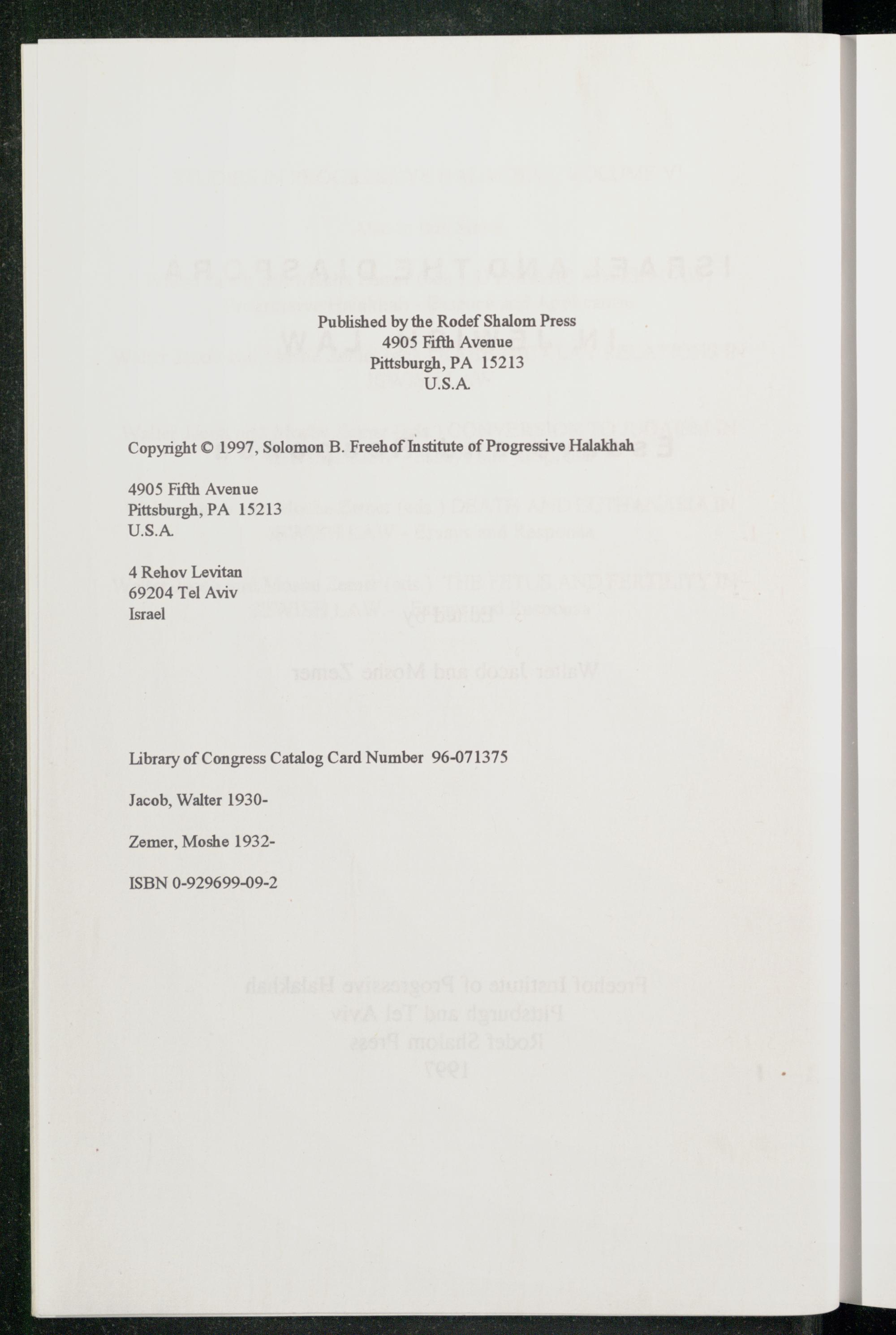 Library of Congress Catalog Card Number 96-071375 Jacob, Walter 1930Zemer, Moshe 1932