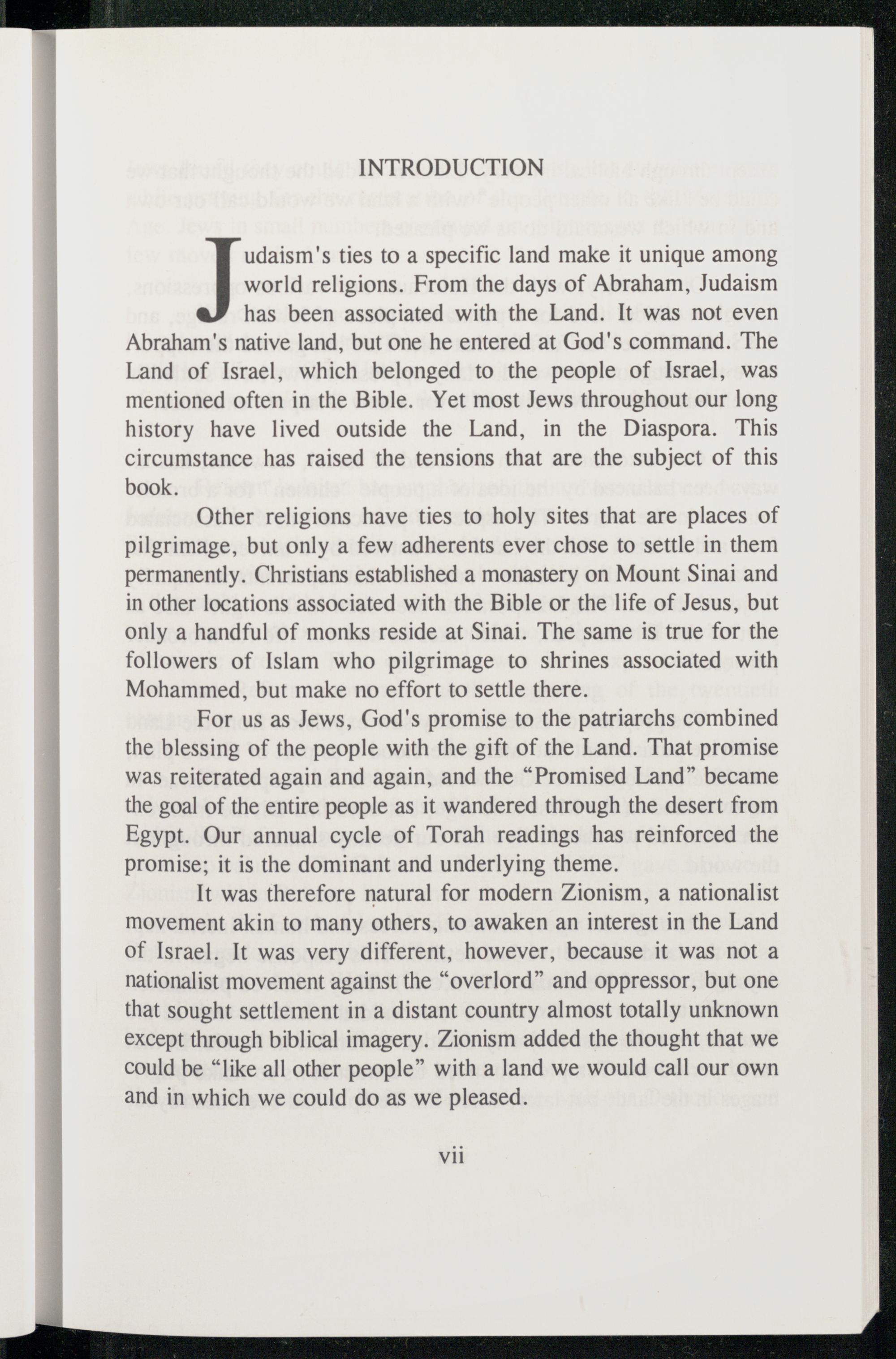 has been associated with the Land. It was not even Abraham 's native land, but one he entered at God 's command. The Land of Israel, which belonged to the people of Israel , was mentioned often in the Bible . Yet most Jews throughout our long history have lived outside the Land, in the Diaspora. This circumstance has raised the tensions that are the subject of this book.