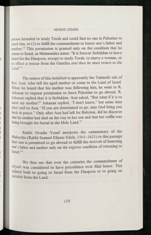 person intended to study Torah and could find no one in Palestine to teach him, or(2) to fulfill the commandment to honor one’s father and mother."® This permission is granted only on the condition that he return to Israel , as Maimonides states:“It is forever forbidden to leave Israel for the Diaspora, except to study Torah , to marry a woman, or to effect a rescue from the Gentiles and then he must return to the Land."