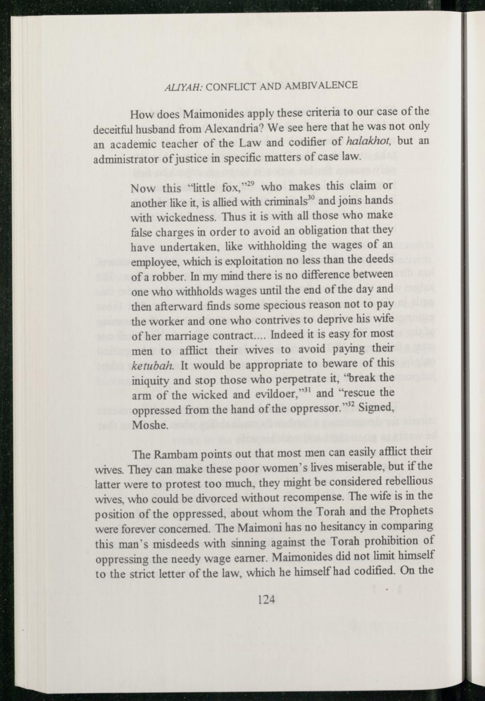Now this“little fox,”” who makes this claim or another like it, is allied with criminals® and joins hands with wickedness. Thus it is with all those who make false charges in order to avoid an obligation that they have undertaken, like withholding the wages of an employee, which is exploitation no less than the deeds of a robber. In my mind there is no difference between one who withholds wages until the end of the day and then afterward finds some specious reason not to pay the worker and one who contrives to deprive his wife of her marriage contract... Indeed it is easy for most men to afflict their wives to avoid paying their ketubah. Tt would be appropriate to beware of this iniquity and stop those who perpetrate it,“break the arm of the wicked and evildoer,™' and“rescue the oppressed from the hand of the oppressor.” Signed, Moshe.