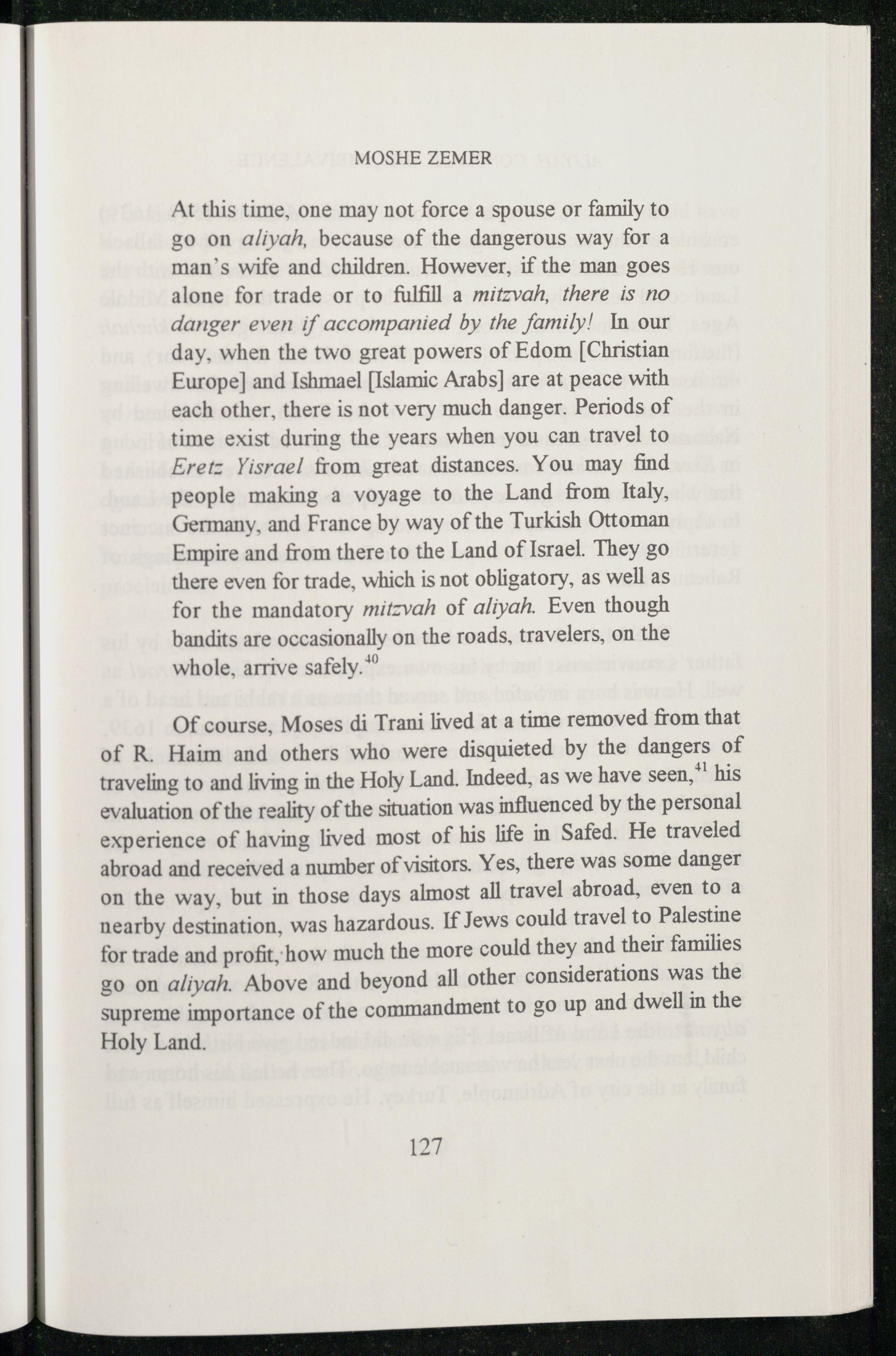 Of course. Moses di Trani lived at a time removed from that of R. Haim and others who were disquieted by the dangers of traveling to and living in the Holy Land. Indeed, as we have seen,*' his evaluation of the reality of the situation was influenced by the personal experience of having lived most of his life in Safed . He traveled abroad and received a number of visitors. Yes, there was some danger on the way, but in those days almost all travel abroad, even to a nearby destination, was hazardous. If Jews could travel to Palestine for trade and profit, how much the more could they and their families go on aliyah. Above and beyond all other considerations was the supreme importance of the commandment to go up and dwell in the