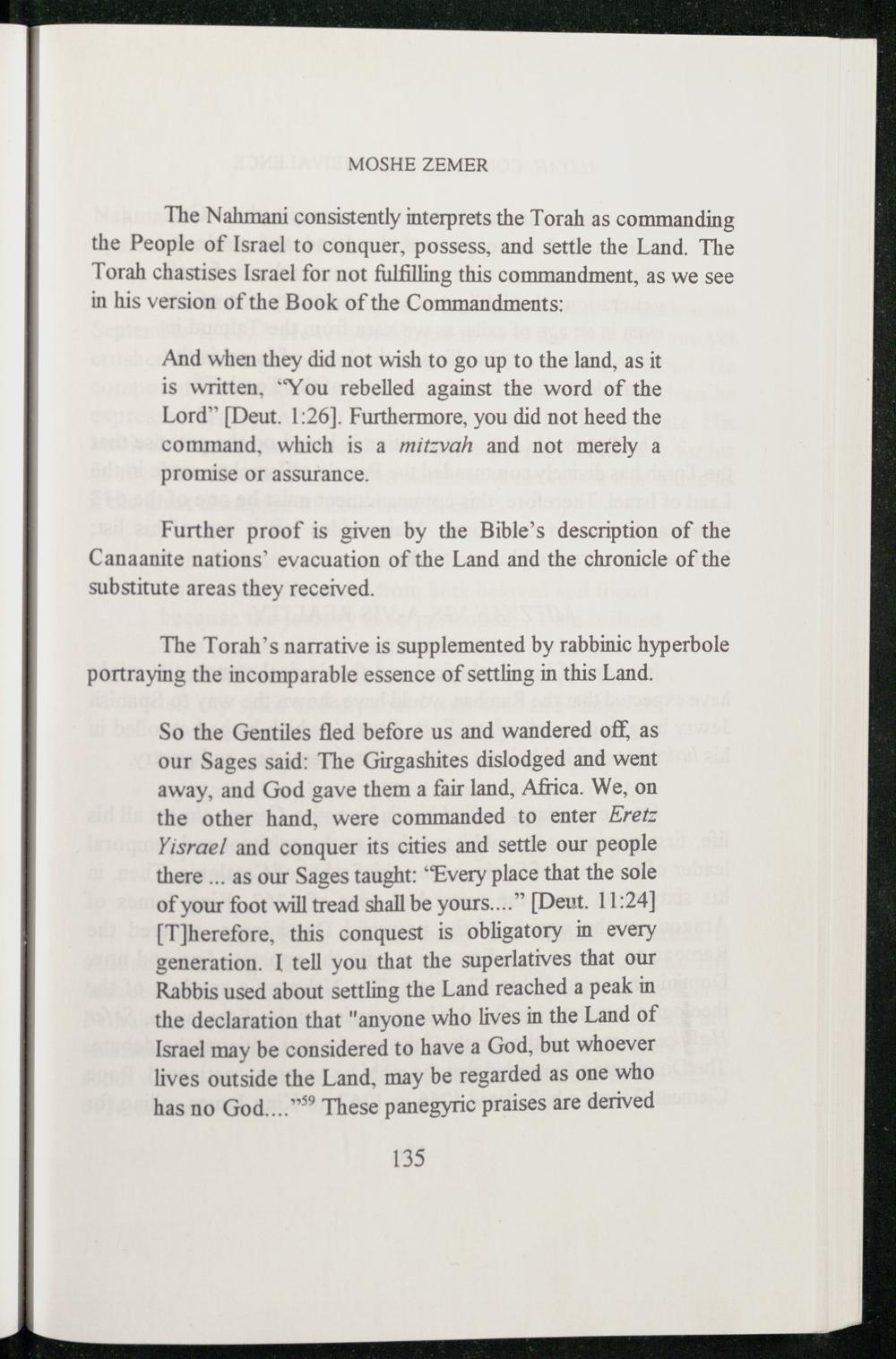 So the Gentiles fled before us and wandered off, as our Sages said: The Girgashites dislodged and went away, and God gave them a fair land, Africa. We, on the other hand, were commanded to enter Eretz Yisrael and conquer its cities and settle our people there... as our Sages taught:“Every place that the sole of your foot will tread shall be yours...”[Deut. 11:24] [T]herefore, this conquest is obligatory in every generation. I tell you that the superlatives that our Rabbis used about settling the Land reached a peak in the declaration that"anyone who lives in the Land of Israel may be considered to have a God , but whoever lives outside the Land, may be regarded as one who has no God ...” These panegyric praises are derived