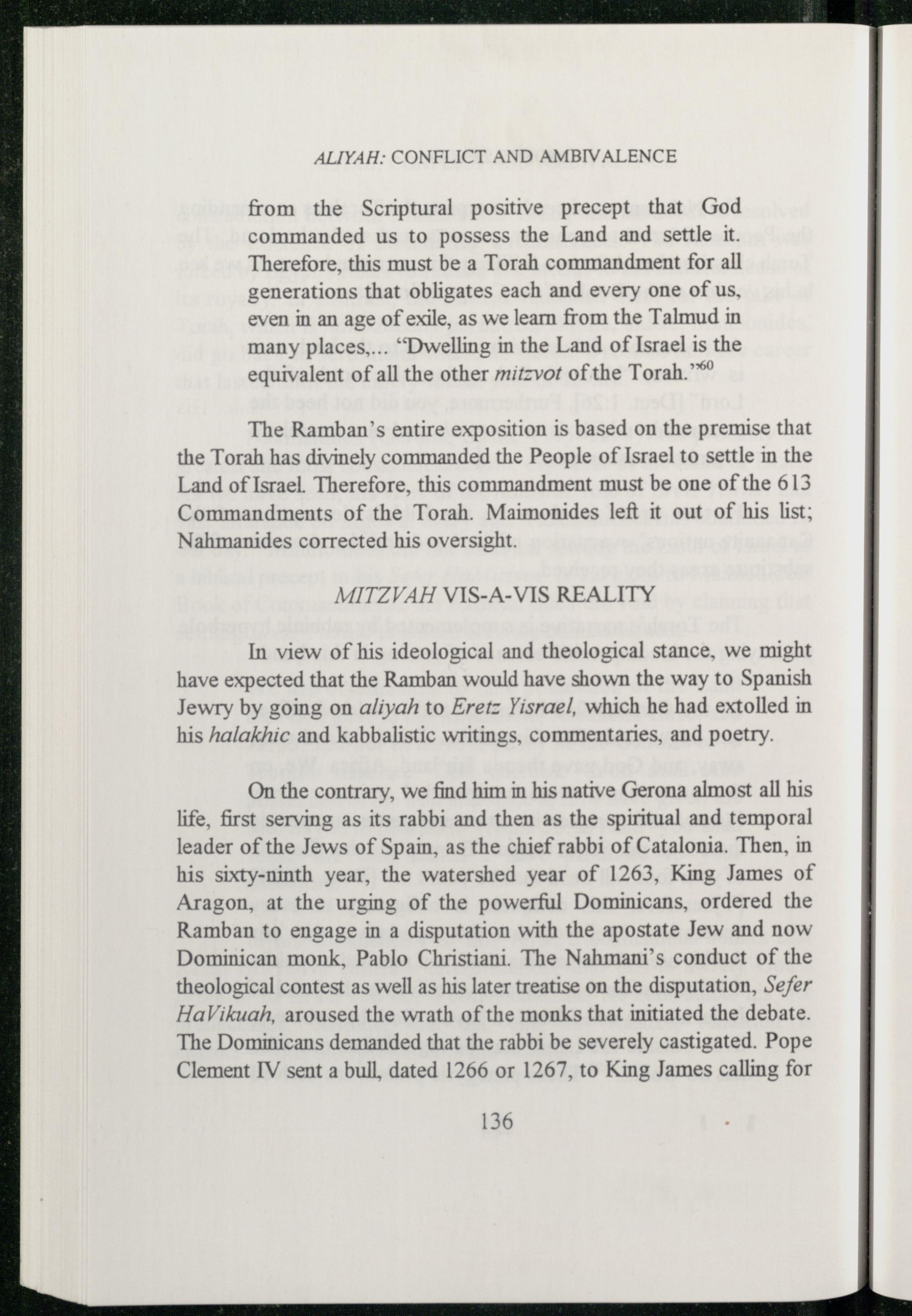 In view of his ideological and theological stance, we might have expected that the Ramban would have shown the way to Spanish Jewry by going on aliyah to Eretz Yisrael, which he had extolled in his halakhic and kabbalistic writings, commentaries, and poetry.