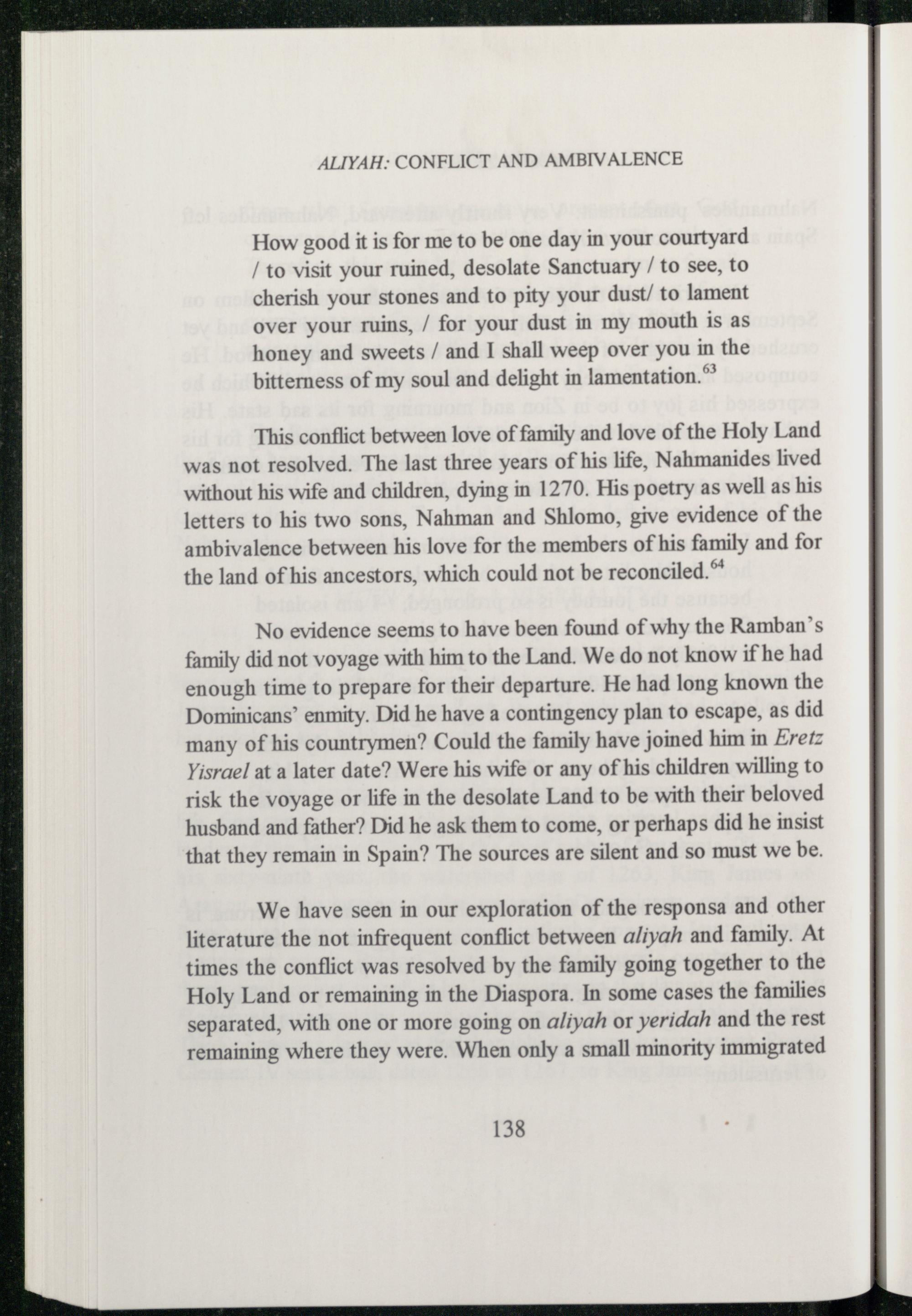 This conflict between love of family and love of the Holy Land was not resolved. The last three years of his life, Nahmanides lived without his wife and children, dying in 1270. His poetry as well as his letters to his two sons, Nahman and Shlomo, give evidence of the ambivalence between his love for the members of his family and for the land of his ancestors, which could not be reconciled.®