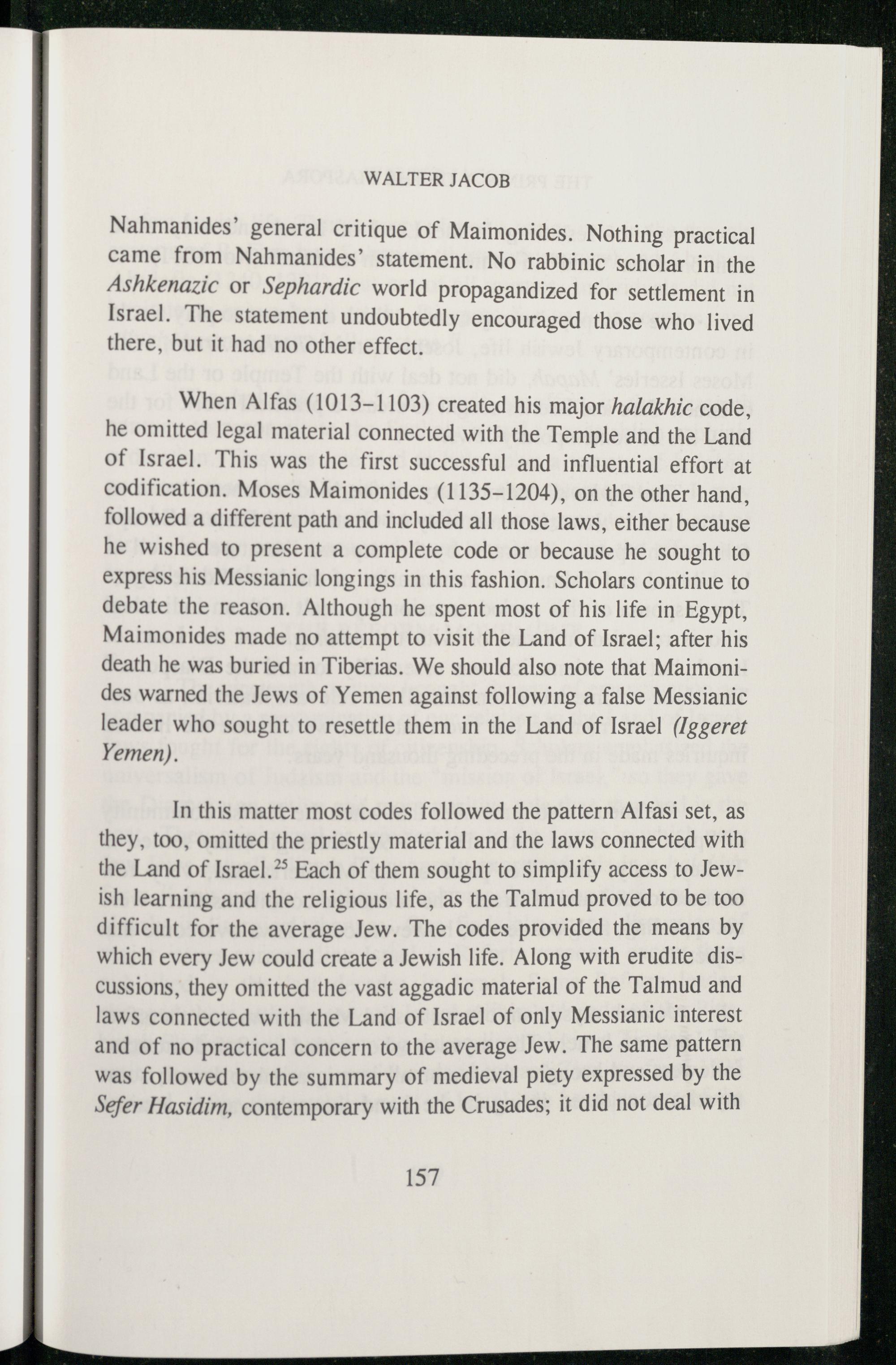 When Alfas(1013-1103) created his major halakhic code, he omitted legal material connected with the Temple and the Land of Israel. This was the first successful and influential effort at codification. Moses Maimonides (1135-1204), on the other hand, followed a different path and included all those laws, either because he wished to present a complete code or because he sought to express his Messianic longings in this fashion. Scholars continue to debate the reason. Although he spent most of his life in Egypt , Maimonides made no attempt to visit the Land of Israel; after his death he was buried in Tiberias . We should also note that Maimoni des