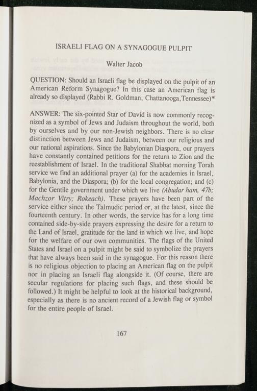 QUESTION: Should an Israeli flag be displayed on the pulpit of an American Reform Synagogue? In this case an American flag is already so displayed(Rabbi R. Goldman, Chattanooga , Tennessee )*
