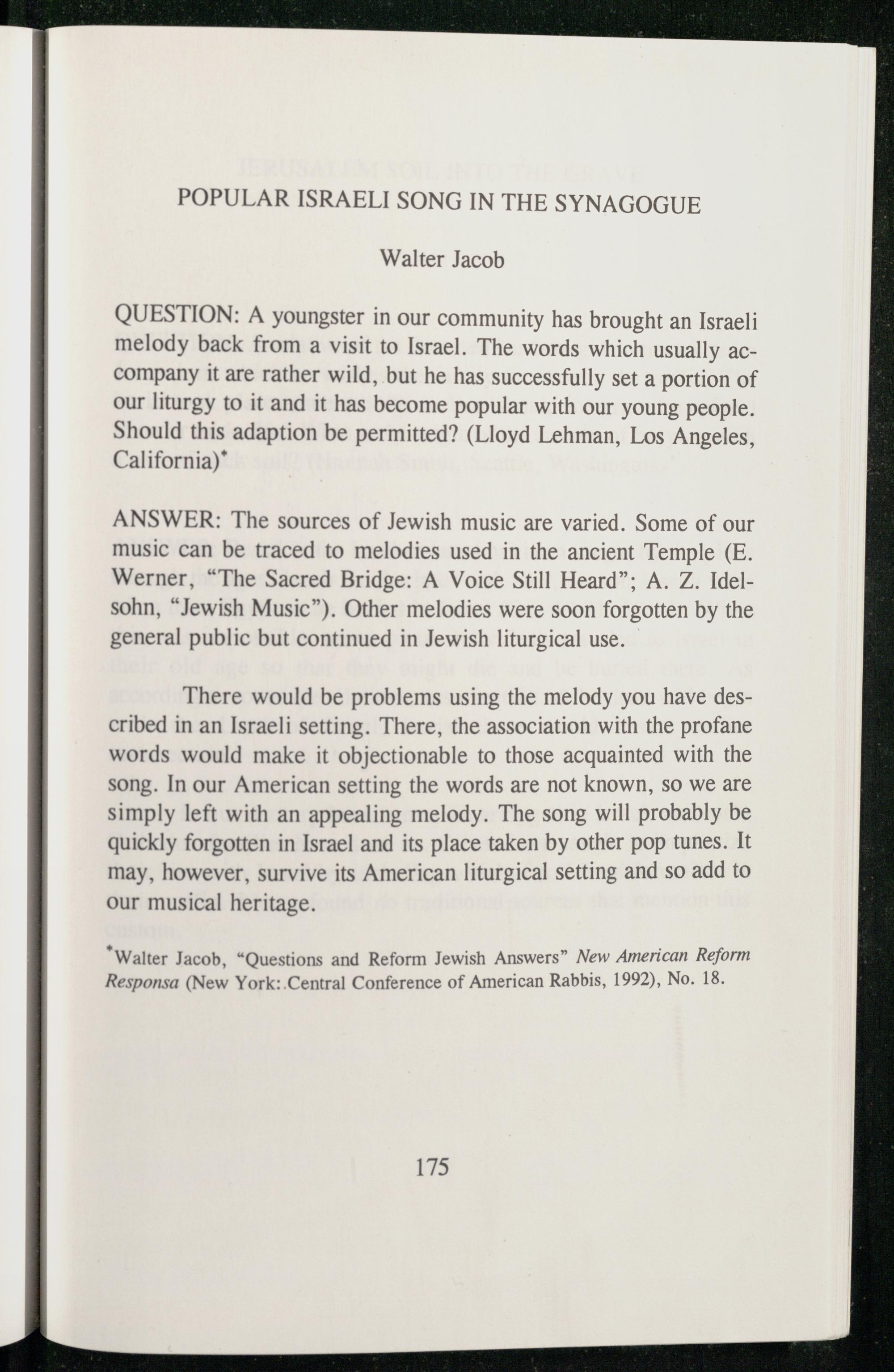 QUESTION: A youngster in our community has brought an Israeli melody back from a visit to Israel . The words which usually accompany it are rather wild, but he has successfully set a portion of our liturgy to it and it has become popular with our young people. Should this adaption be permitted?(Lloyd Lehman, Los Angeles , California )"