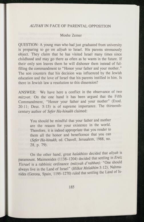 QUESTION: A young man who had just graduated from university is preparing to go on aliyah to Israel . His parents strenuously object. They claim that he has visited Israel many times since childhood and may go there as often as he wants in the future. If their only son leaves them he will dishonor them instead of fulfilling the commandment to“Honor your father and your mother.” The son counters that his decision was influenced by the Jewish education and the love of Israel that his parents instilled in him. Is there in Jewish law a resolution to this dissension?